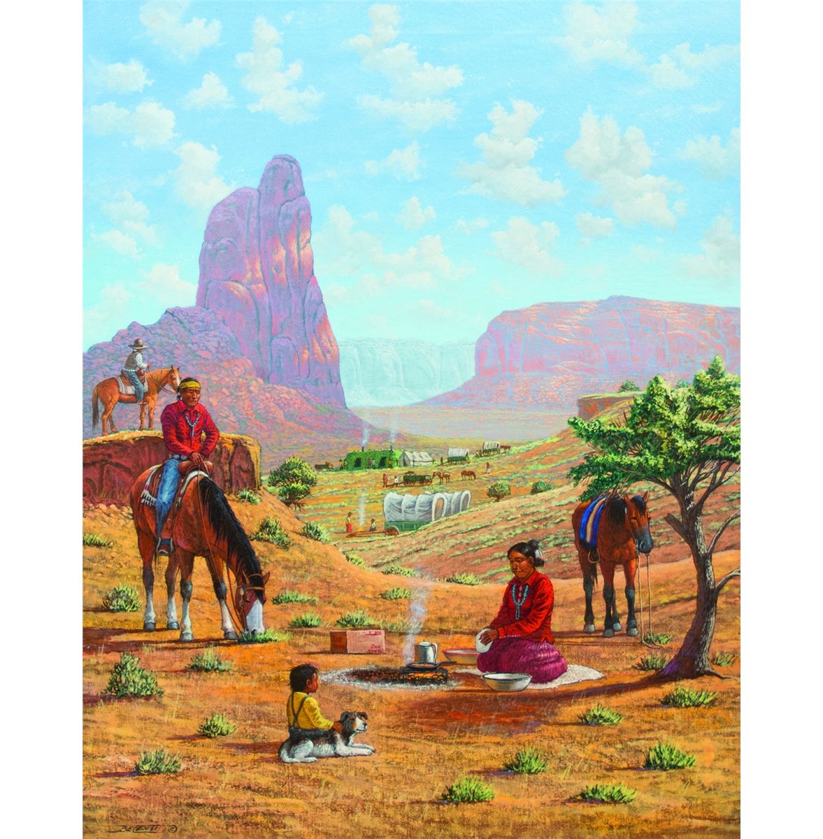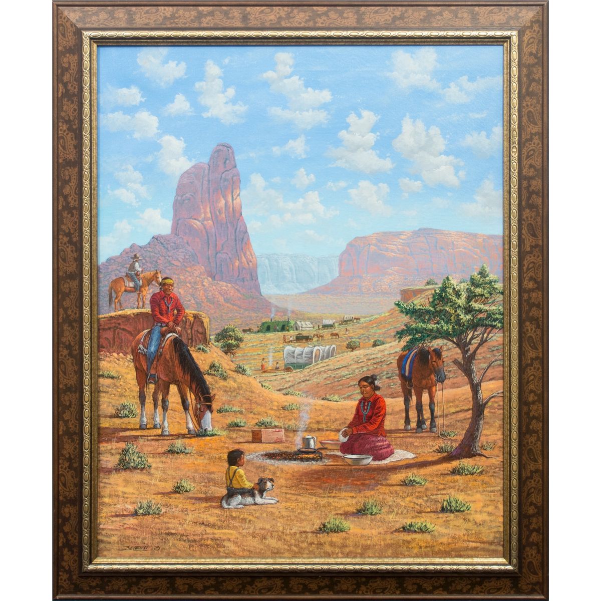 Robert Becenti, Jr. (1949-2001). Summer Camp. 28" x 22" oil on canvas. Signed lower left: BECENTI. Provenance: Golden Eagle Trading Co.
