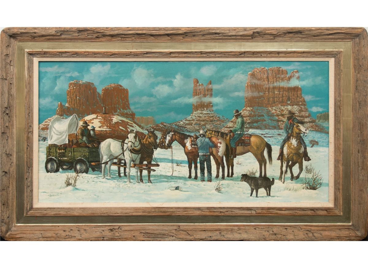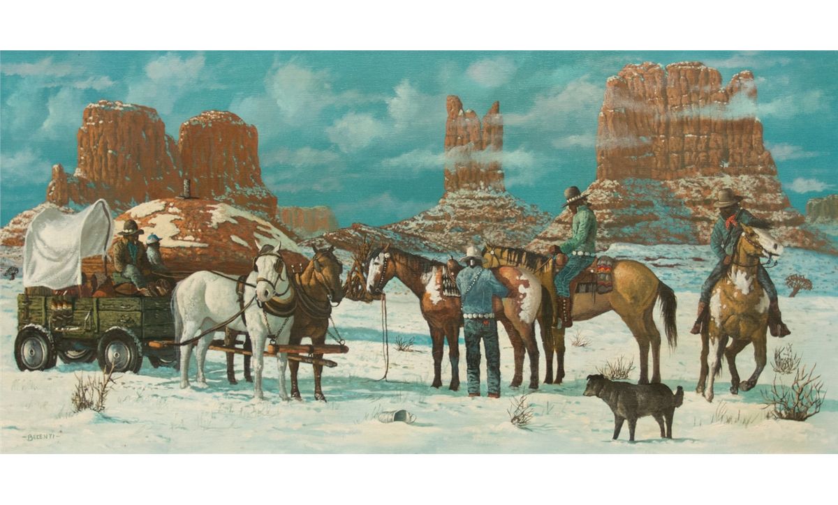 Robert Becenti, Jr. (1949 - 2001). Saddle Up! 18" x 36" oil on canvas. Signed lower left: BECENTI. Provenance: Golden Eagle Trading Co.