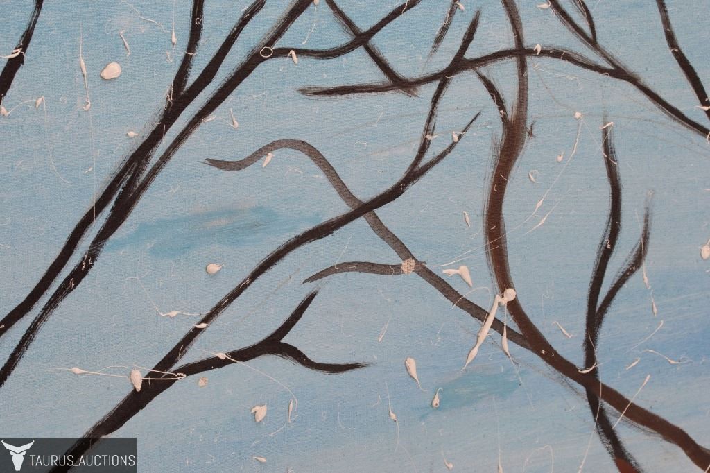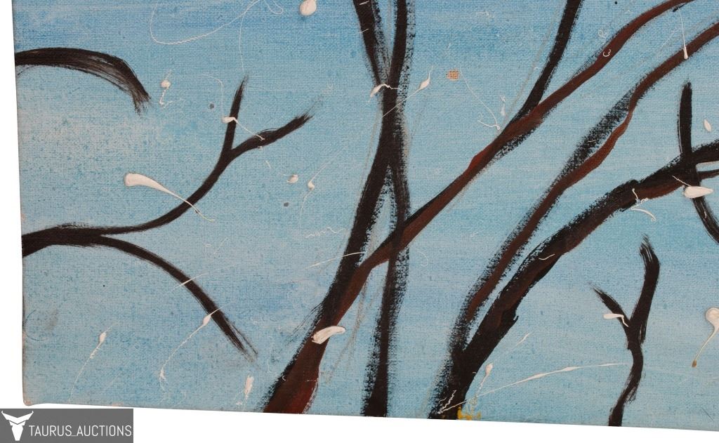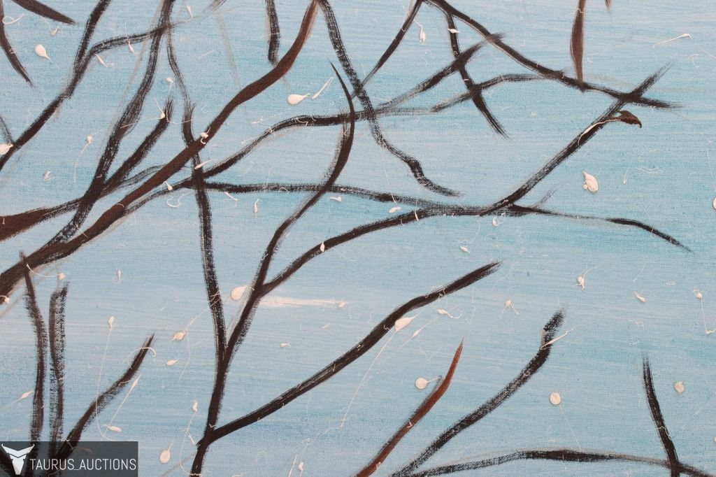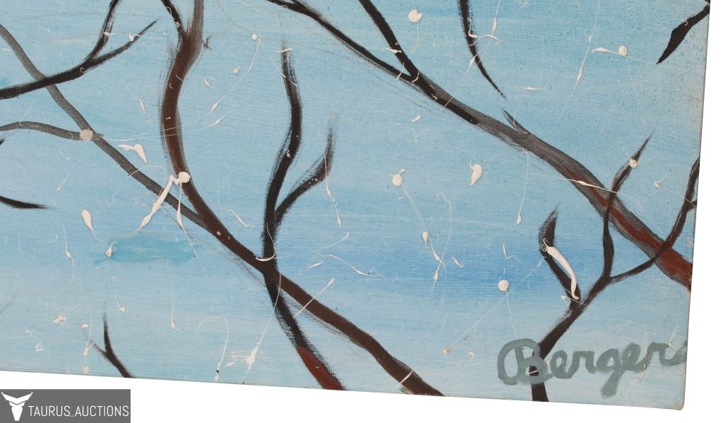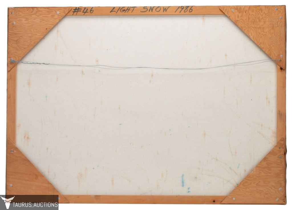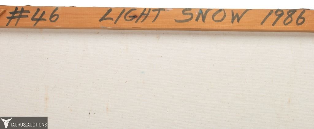 Item/Description: Original impressionist oil painting by New York artist Robert Berger. Features a view looking up at the snowy sky through bare trees. Signed lower right: Berger. Titled and dated on stretcher bar: #46 / Light Snow / 1986.