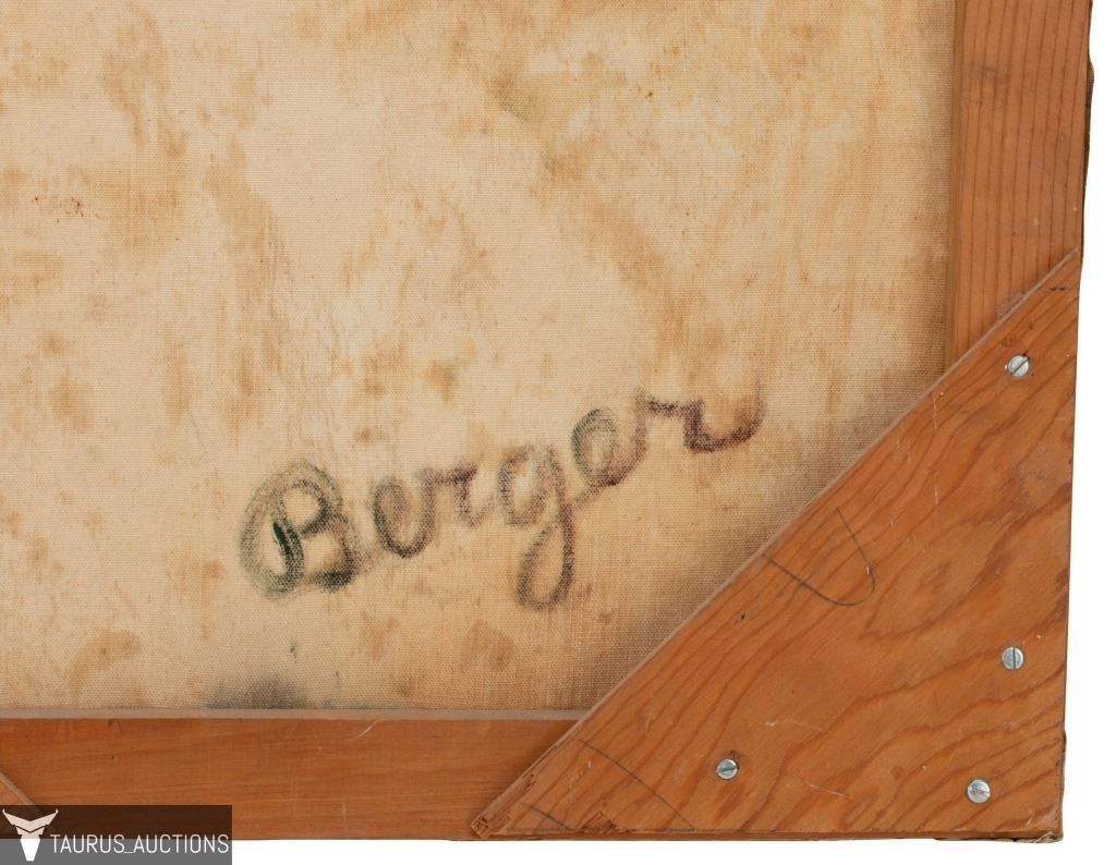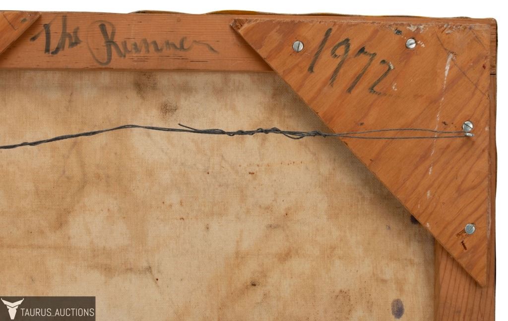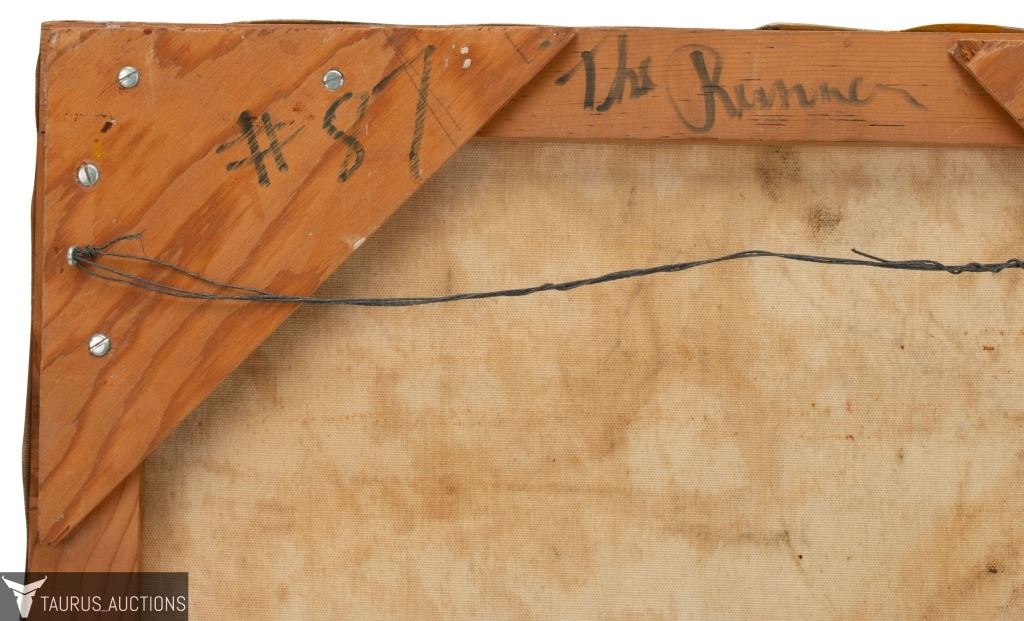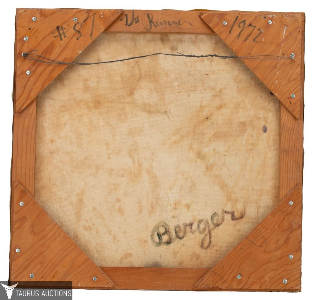 Item/Description: Original, Mid-Century modern abstract painting by New York artist Robert Berger. Signed en verso: Berger. Titled and dated on stretcher bar: #87 The Runner / 1972.