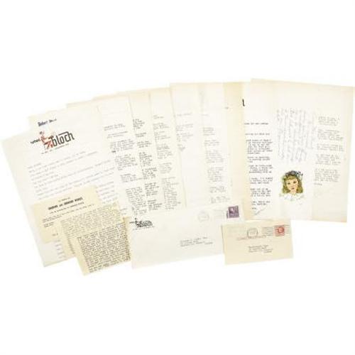 <B>Robert Bloch. Archive of 1950s Correspondence to Prominent Canadian Science Fiction Fan and Toronto Science Fiction Society Member William D. Grant</B></I>, including: <B><BR>Three two-page Typed Letters Signed</B></I> "Bob", 8.5" x 11", n.p., n.d. [1950s]. Written on Bloch's personal stationery. In these letters, Bloch writes of his personal life and of his life in the science fiction community, and of Grant's involvement in Torcon, the Toronto Science Fiction Convention. One of the letters is a scathing review of Chaplin's film, <I>A King in New York</B></I>. All in fine or better condition.<BR><BR>[And:]<BR><B><BR>Four single page Typed Letters Signed</B></I> "Bob", 8.5" x 11", n.p., n.d. [1950s]. Written on plain paper. In these letters, Bloch discusses Grant's Canadian science fiction publication CANFAN, his own abiding interest in jazz music, and events relating to the Midwest science fiction convention, MidwestCon. All in fine or better condition.<BR><BR>[And:]<BR><B><BR>Two-page Typed Letter</B></I>, signed "RB" in print, 8.5" x 11", plain paper, n.p., n.d. [1956]. Bloch was the Guest of Honor at the first Torcon in 1948, and William Grant wanted to republish the speech Bloch gave at that hallowed event. Bloch agreed. This is the "Introductory Note" to Grant's republication of Bloch's 1948 speech. Fine condition.<BR><BR><And:]<BR><B><BR>Three Typed Notes Signed</B></I> "Bob", 5.5" x 3.25", plain postcards, two with Bloch's return address stamped on the front, Weyauwega, Wisconsin, 1955-1956. One of these postcards is especially interesting, in that Bloch wrote it while Fritz Leiber was a house guest, and the bulk of the card discusses H. P. Lovecraft. Bloch writes "Fact is, HPL, despite physical and psychic and economic handicaps which would swamp a lot of people (including, I suspect, most of his critics) managed to help support his maiden aunts, worked like a dog, was a friend to scores of writers, and-most important-never compromised in his own work but wrote it honestly: i.e., as he thought it should be written. How many of today's check-hungry authors can say the same? The man had guts." Indeed. Also includes an unsigned postcard advertising <I>Unknown and Unknown Worlds</B></I>, a publication for which Bloch wrote the introduction. Fine condition.<BR><BR>[And:]<BR><B><BR>Typed Letter from William D. Grant to Robert Bloch</B></I>. One page, 8.5" x 11", plain paper, n.p., July 23, 1954. In this brief but cordial letter, Grant consoles Bloch on his wife Marion, whose health had recently worsened, hastening the Blochs' move to Weyauwega, Wisconsin. Fine condition.<BR><BR>[And:]<BR><B><BR>Manuscript Note Signed from Marion Bloch to William Grant's Wife </B></I>"Marion". One page, 9" x 6.75", card stock, n.p., n.d. Accompanied by the original mailing envelope with Bloch's pre-printed return address label. This short note from Bloch's wife is a Thank You note for a painting that Mrs. Grant recently sent to the Blochs. Fine condition. <I>From the Robert and Diane Yaspan Collection.</B></I><BR><BR><b>Shipping:</b> Flat Material, Small (<a target="_blank" href="http://www.heritageauctions.com/common/shipping.php">view shipping information</a>)