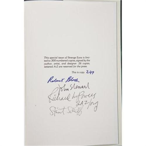 <B>Robert Bloch</B></I>. <B>Three Signed First Editions</B></I>, including: <B><I>Cold Chills</B></I></B></I>. Garden City, NY: Doubleday and Company, Inc., 1977. Signed "<I>Robert Bloch</B></I>" on front endpaper. Octavo. 178 pages. Quarter-bound with black spine and orange paper on boards. Overall, book and dust jacket are fine. [and:] <B><I>The King of Terrors</B></I></B></I>. New York: The Mysterious Press, 1977. Signed, limited edition in slipcase. Number 125 of 250 copies. Signed "<I>Robert Bloch</B></I>" on the limitation page. Octavo. 202 pages. Black cloth with gold spine titles. [and:] <B><I>Strange Eons</B></I></B></I>. [Chapel Hill, NC]: Whispers Press, 1978. Signed, limited edition in slipcase. Number 249 of 300 copies. Signed on limitation page by Robert Bloch, John Stewart (illustrator), Richard Powers (cover illustrator), and Stuart Schiff (contributor). Octavo. 194 pages. Blue cloth with gold spine titles. Overall, books and dust jackets are fine. Cloth slipcases are near fine with minor wear. <I>From the Robert and Diane Yaspan Collection.</B></I><BR><BR><b>Shipping:</b> Books & Catalogs (<a target="_blank" href="http://www.heritageauctions.com/common/shipping.php">view shipping information</a>)