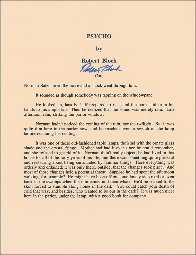 Two identical souvenir typescripts, one page, 8.5 x 11, both of the first page of Chapter One of Psycho, each signed at the top in blue felt tip. In fine condition.