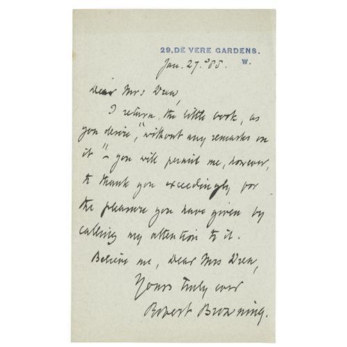 <B> Robert Browning Autograph Letter Signed </B></I> <I> Robert Browning." </B></I> One page, 4.25" x 7", De Vere Gardens, London, January 27th, 1888. The letter was written to a Mrs. Drew; the content is routine. The signature is bold and dark, a very nice example! <r The letter is in very fine condition; the usual folds are present; light toning along the upper edge. From the Henry E. Luhrs Collection. Accompanied by LOA from PSA/DNA.