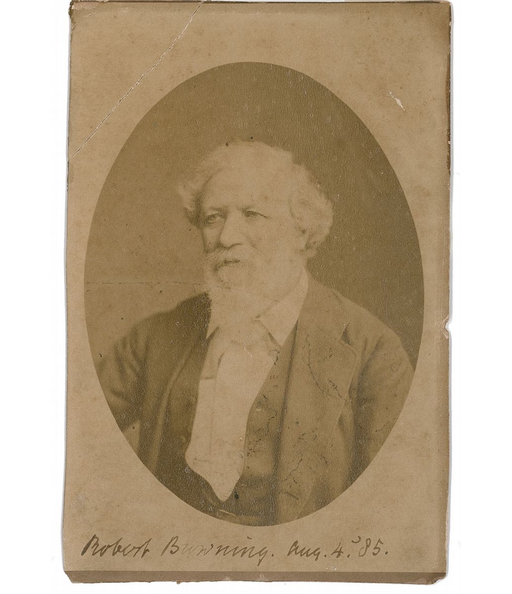 English poet and playwright (1812–1889) who perfected the dramatic monologue in such works as My Last Duchess and Soliloquy of the Spanish Cloister. Original sepia 4 x 6 cabinet photo of the poet in a suit and tie, signed along the bottom in black ink, “Robert Browning Aug. 4 ‘85.” Moderate crease to top left corner, scattered silvering to image, as well as some light spotting and soiling, a chip to right edge, and mounting remnants to reverse, resulting in some slight surface loss, otherwise very good condition. Just the second signed portrait of Browning we have ever offered, signed shortly after the publication of one of his final works, Ferishtah's Fancies.