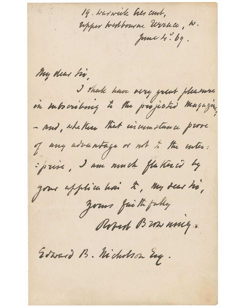ALS, one page, 4.25 x 7, June 4, 1869. Letter to Edward B. Nicholson. In full: “I shall have very great pleasure in subscribing to the projected magazine—and, whether that circumstance prove of any advantage or not to the enterprise, I am much flattered by your application.” Scattered mild toning and soiling, otherwise fine condition.