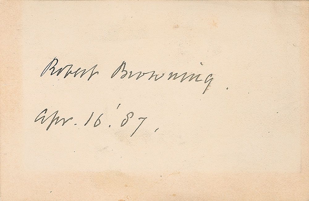 English poet and playwright (1812–1889) who perfected the dramatic monologue in such works as My Last Duchess and Soliloquy of the Spanish Cloister. Ink signature, “Robert Browning, Apr. 16, ‘87,” on an off-white 4 x 2.5 card. In very good condition, with