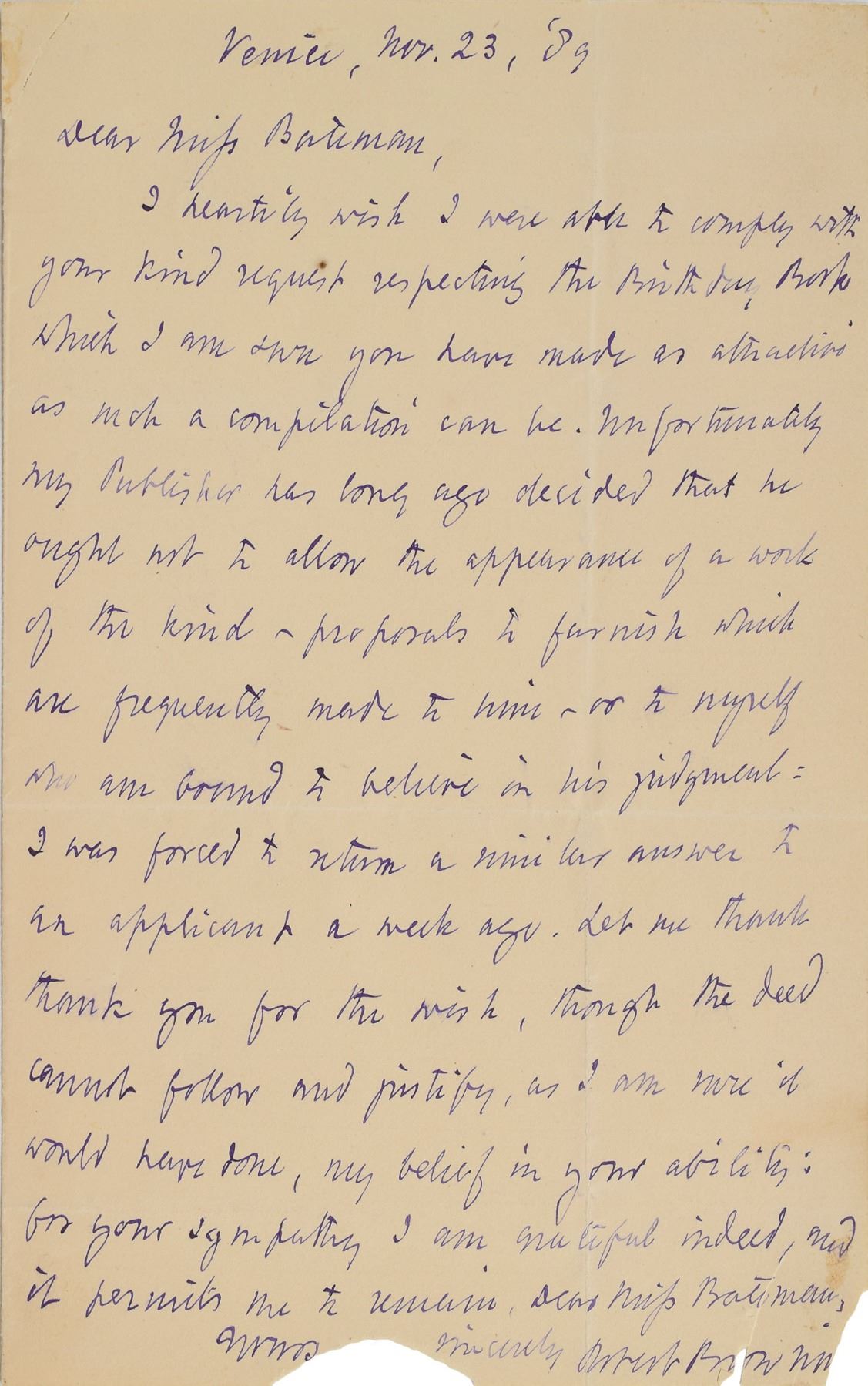 ALS signed “Robert Brownin[g],” one page, 4.25 x 7, November 23, 1889. Letter to Miss Bateman, in part: "I heartily wish I were able to comply with your kind request respecting the Birthday Book which I am sure you have made as attractive as such a compilation can be. Unfortunately my publisher has long ago decided that he ought not to allow the appearance of a work of the kind—proposals to furnish which are frequently made to him—or to myself who am bound to believe in his judgment." In very good to fine condition, with trimmed edges, a tear through the last name, and paper loss to the bottom edge and corner affecting the signature. Accompanied by an ALS by his son, Robert Barrett Browning, dated January 16, 1890, in part: "I hope you will let me thank you, however tardily, for your most kind letter. All you wrote gave me great pleasure, and I am truly grateful for your sympathy." Robert Browning had passed away on December 12, 1889.