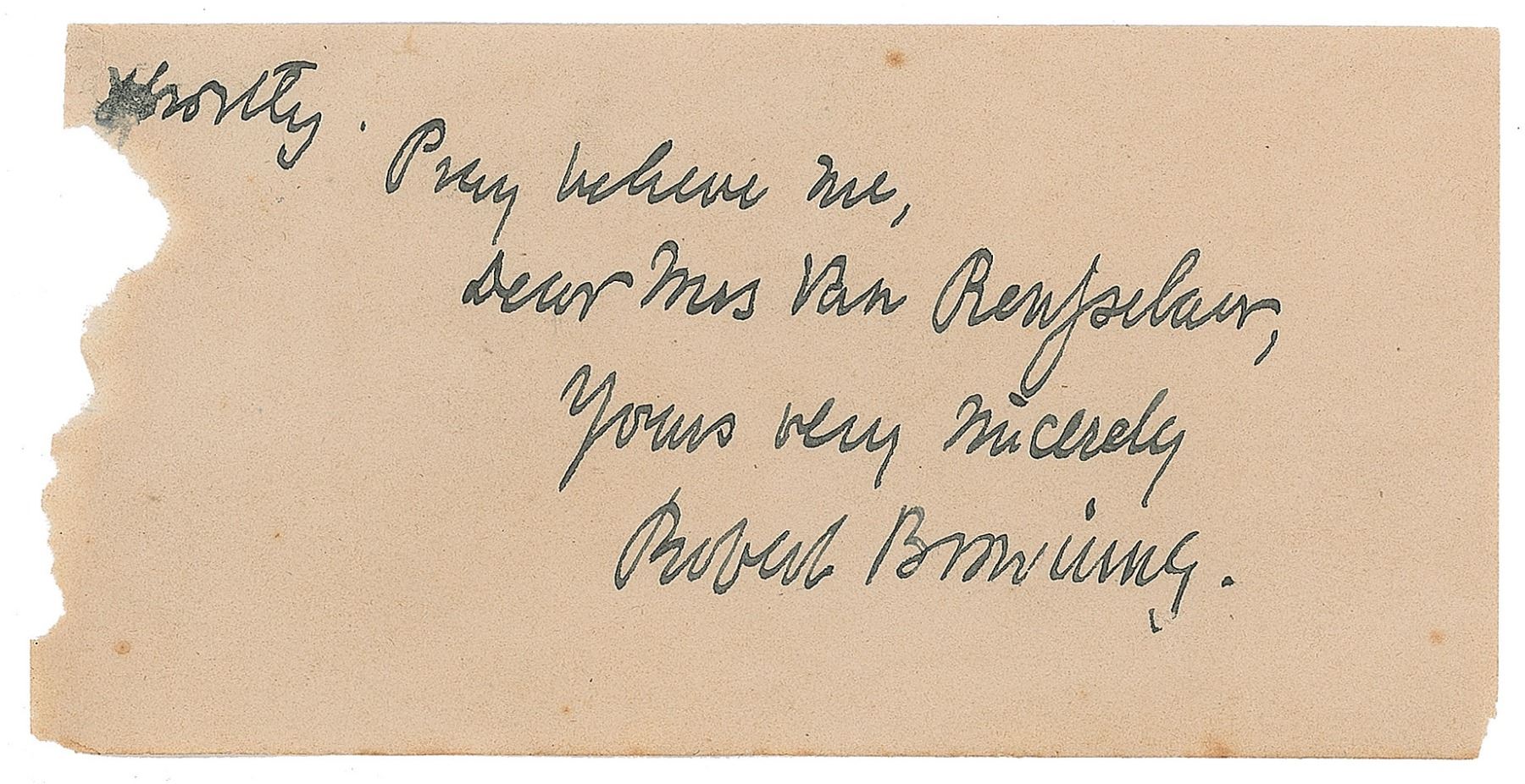 Ink signature, "shortly. Pray believe me, Dear Mrs. Van Rensselaer, Yours very sincerely, Robert Browning,” on an off-white 4.5 x 2.25 slip clipped from the close of a letter. In fine condition, with paper loss to the left side, easily matted out. Accompanied by a vintage portrait print of the poet.