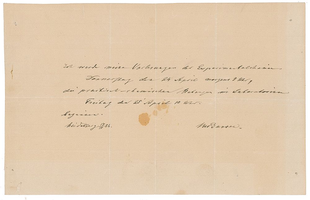 German chemist (1811–1899) who discovered the elements cesium and rubidium and who developed the laboratory burner that now bears his name. ALS in German, signed “R. W. Bunsen,” one page, lightly-lined, 8.75 x 5.5, April 17, 1884. In full (translated): “I will begin my lectures in Experimental Chemistry Thursday, April 24 at 9 o’clock in the morning, the practical chemical experiments in the laboratory Friday April 25 at 10 o’clock.” In fine condition, with mailing folds and some mild scattered wrinkling and toning. A terrific scientific reference by the esteemed chemist.
