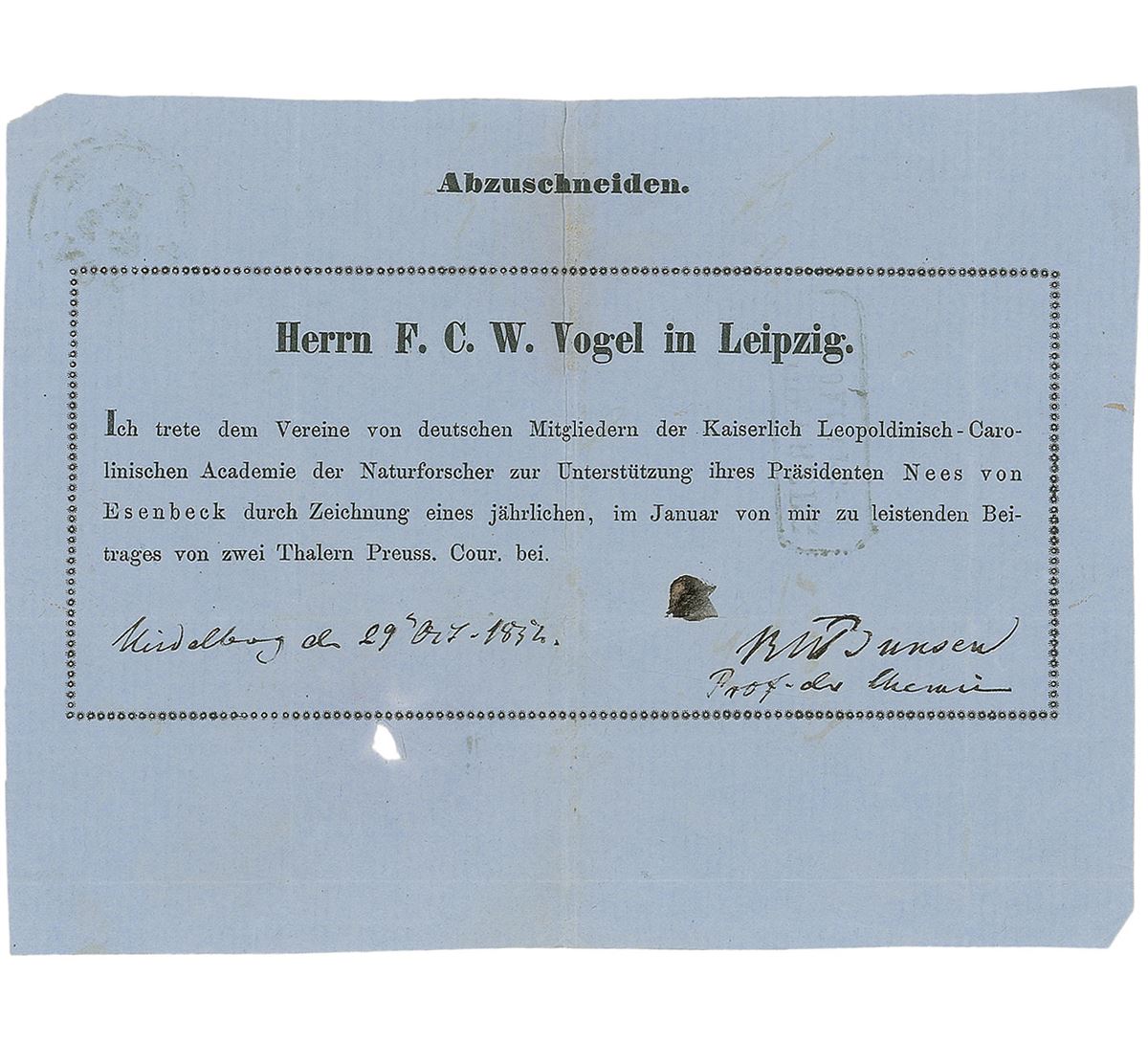 German chemist (1811–1899) who discovered the elements cesium and rubidium and who developed the laboratory burner that now bears his name. Certificate for Herrn F. C. W. Vogel in Leipzig, signed “R. W. Bunsen, Prof. der Chemie,” one page, 6.5 x 5, October 29, 1854. In very good condition, with intersecting folds, overall creases, and a small area of paper loss to lower border.