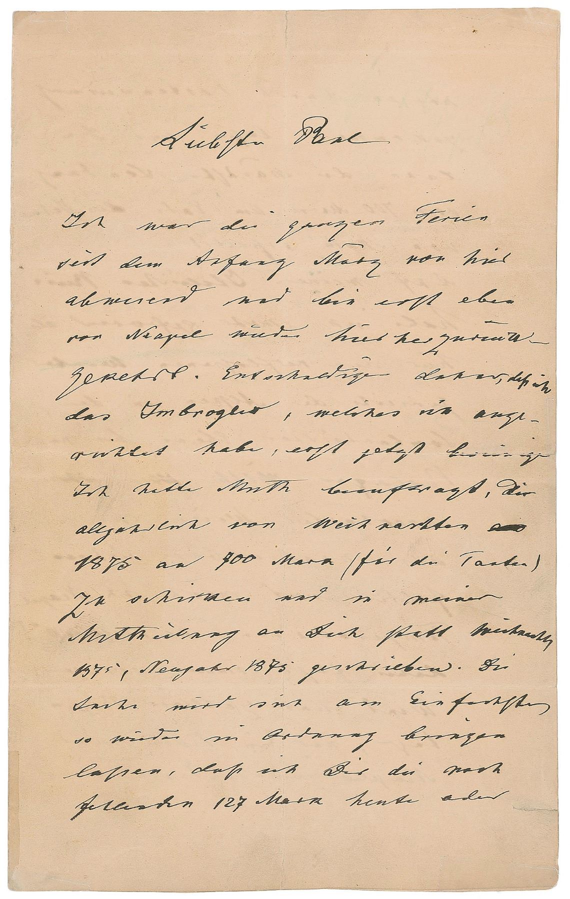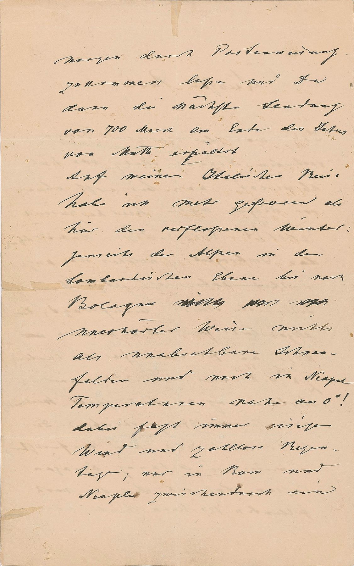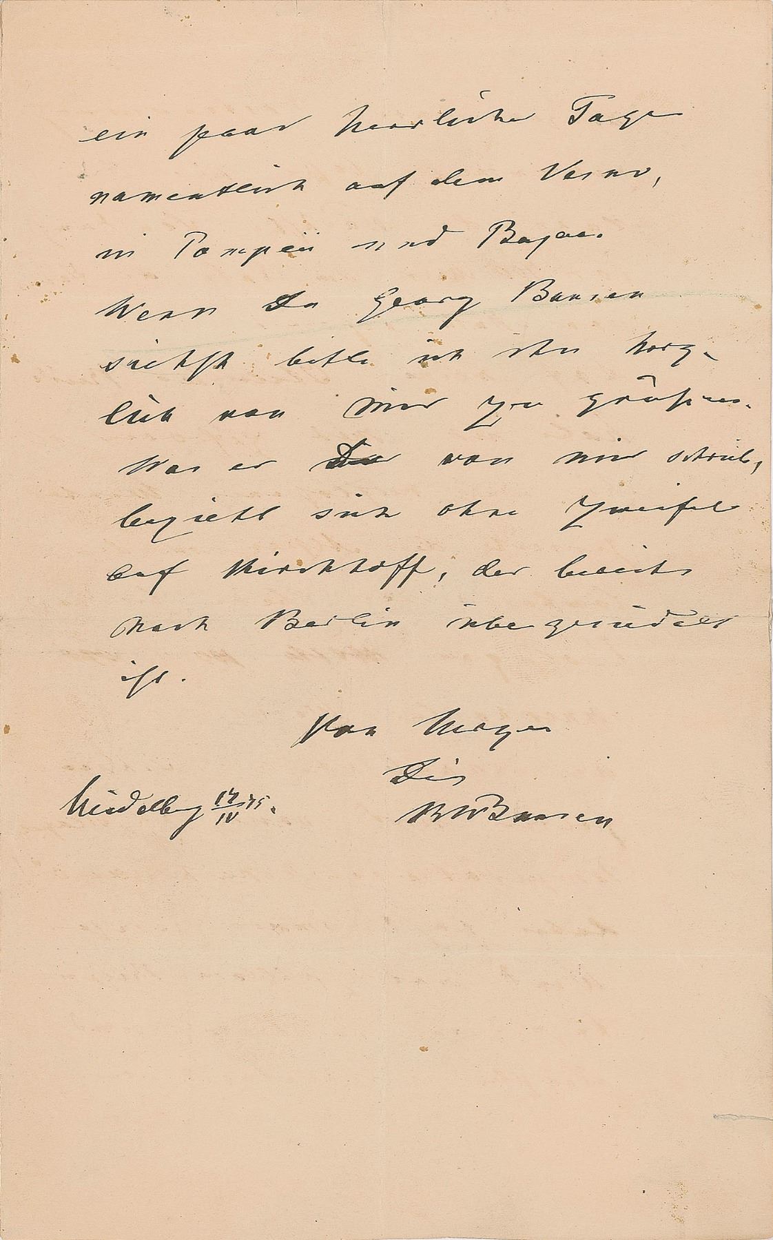 German chemist (1811–1899) who discovered the elements cesium and rubidium, and who developed the laboratory burner that now bears his name. ALS in German, signed “R. W. Bunsen,” three pages on two adjoining sheets, 5.5 x 9, April 17, 1875. Letter to "Paul," giving some impressions from a travel through Italy, and sending greetings to the Prussian politician Georg Bunsen. In fine condition, with a few repairs to small edge tears.