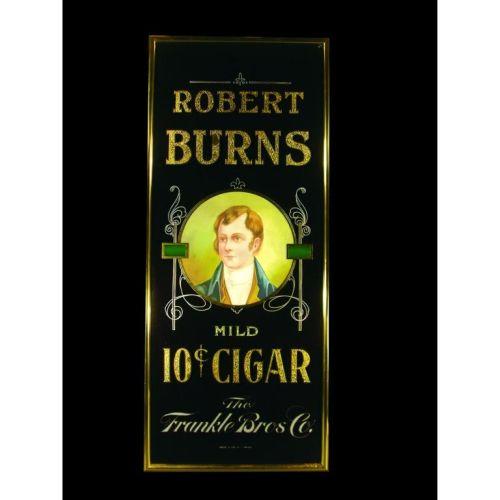Robert Burns Cigars Reverse Glass Sign. Small chip in upper corner otherwise excellent condition. 24 x 60 inches image only.