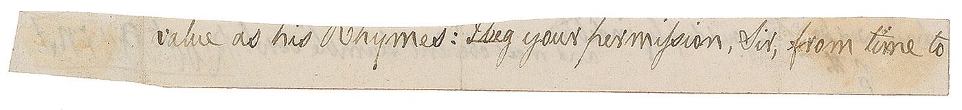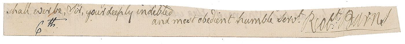 Eminent Scottish poet and songwriter (1759–1796) who was a seminal figure of the Romantic movement and whose verses and songs (including 'Auld Lang Syne') take a place among the most durable and beloved works in the history of Western literature. Ink signature, "Rob't Burns,” on an off-white 8.5 x .5 slip clipped from the end of an autograph letter. The closing fragment reads: "shall ever be, Sir, your deeply indebted and most obedient humble sevt." The reverse reads: "value as his Rhymes: I beg your permission, Sir, from time to." In fine condition.