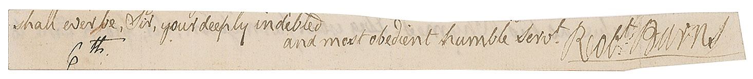 Eminent Scottish poet and songwriter (1759–1796) who was a seminal figure of the Romantic movement and whose verses and songs (including 'Auld Lang Syne') take a place among the most durable and beloved works in the history of Western literature. Ink signature, "Rob't Burns,” on an off-white 8.5 x .5 slip clipped from the end of an autograph letter. The closing fragment reads: "shall ever be, Sir, your deeply indebted and most obedient humble sevt." The reverse reads: "value as his Rhymes: I beg your permission, Sir, from time to." In fine condition.