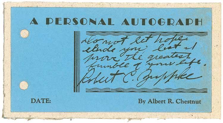 Head football coach (1879-1957) at the University of Illinois from 1913 until 1941. Inducted into the College Football Hall of Fame in 1951, Zuppke coached his teams to national titles in 1914, 1919, 1923, and 1927. Vintage fountain pen AQS on a 5.5 x 2.75 blue card from the Albert R. Chestnut collection: “Do not let hope elude you lest it prove the greatest fumble of your life, Robert C. Zuppke.” Attached to a slightly larger heavy gray card, with light toning to right edge, otherwise fine condition. From his Pennsylvania home, Chestnut, a printer by profession, began collecting autographs in 1935. He sent these personally-printed cards to over a thousand celebrities and received favorable replies from the vast majority, finally retiring from collecting to raise his family when postage increased from 2¢ per card! Pre-certified Steve Grad/PSA/DNA and RRAuction COA.
