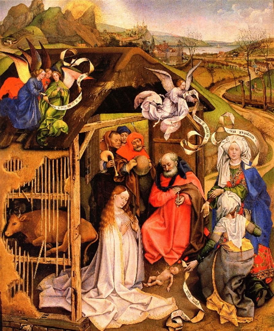 Artist: Robert Campin - Title: Birth of Christ - Medium: Fine Art Giclee on Canvas - Image Size: Approximately 32 inches x 26.5 inches - Unframed on Unstretched Canvas - Biography: Robert Campin (c. 1375 - 26 April 1444), now usually identified with the Master of Flemalle (earlier the Master of the Merode Triptych, before the discovery of three other similar panels), was the first great master of Flemish and Early Netherlandish painting. Campin's identity and the attribution of the paintings in both the "Campin" and "Master of Flemalle" groupings have been a matter of controversy for decades. Campin was highly successful during his lifetime, and thus his activities are relatively well documented,but he did not sign or date his works, and none can be confidently connected with him.