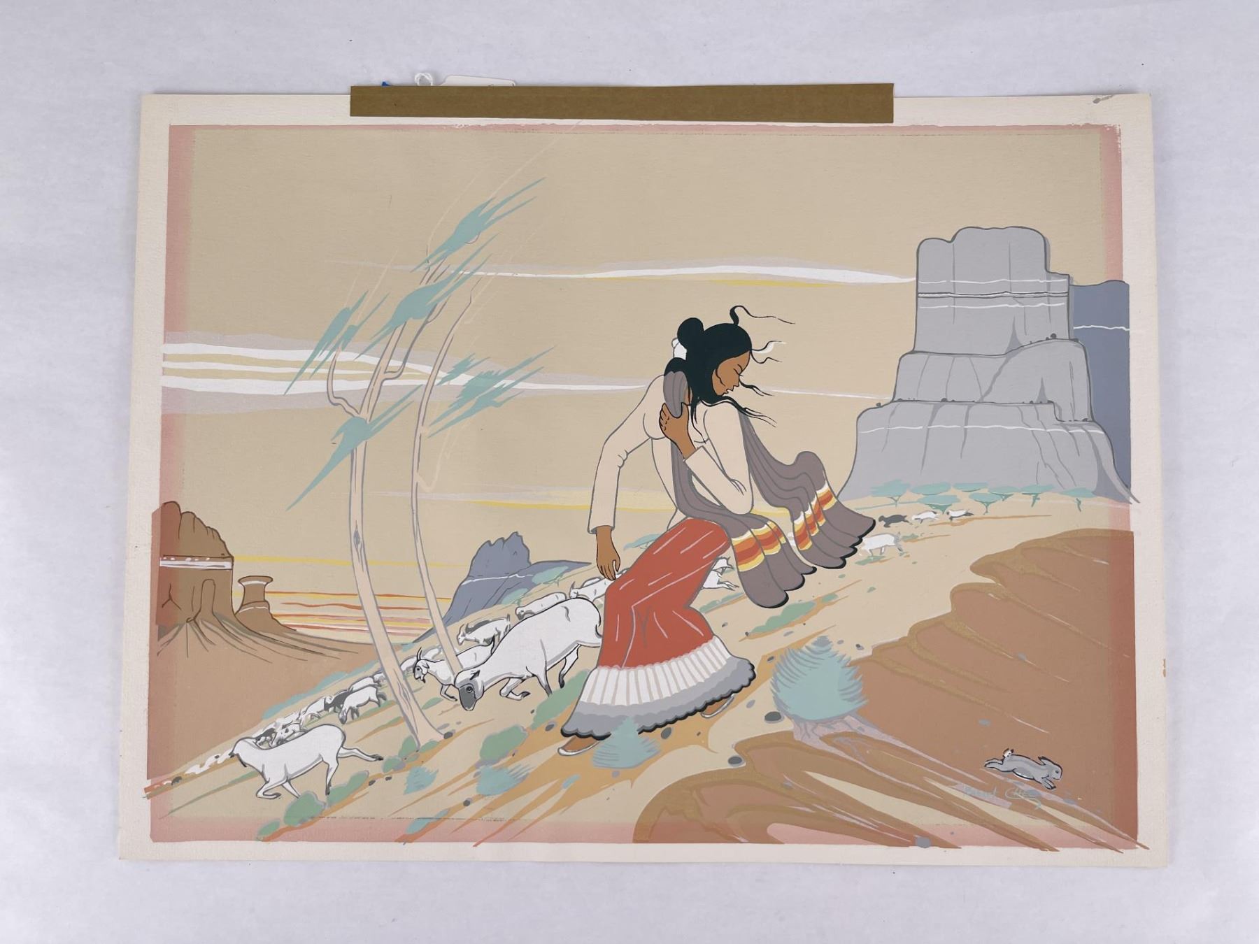 15" by 20". Robert (Hashke-Yil-Cale) Chee (1938 - 1972) was active/lived in Arizona. Robert Chee is known for Figure, genre, landscape, mural. Military: (1958-1961) When serving in the Army overseas, the officers arranged for him to paint murals on the walls of army buildings in lieu of army duties. Robert's mother, although uneducated in white man's ways, recognized his talent and encouraged him to enroll in the Inter-Mountain School at Brigham, Utah, where he could receive art instruction along with his academic training. While there, he studied with Allan Houser. Allard Auction Collection Inv: AX