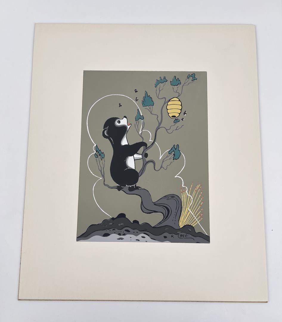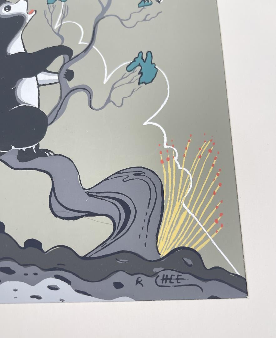 Nice Serigraph by Robert Chee. Roadrunner. 10" by 12" including matte. Artist Robert Chee was Diné painter. He had a short but very active career. He is noted for two-dimensional strongly decorative work with bright colors. He adhered to all the characteristics of traditional Navajo painting. He frequently used dark backgrounds on his paintings and often used gold paint. His work is very fluid and with exceptional detail and finesse. The colors are bright, but soft at the same time. He was an exceptional painter. It is a tragedy that he did not live longer as and just 34 when he died. Robert Chee (1937-1971) Hashke-Yil-e-Cale was in the military from 1958 to 1961 and painted murals in Army buildings in Germany during that time. He studied with Allan Houser, the famous Apache artist.