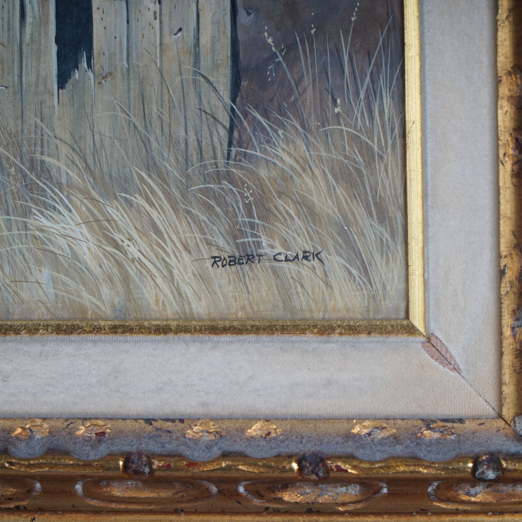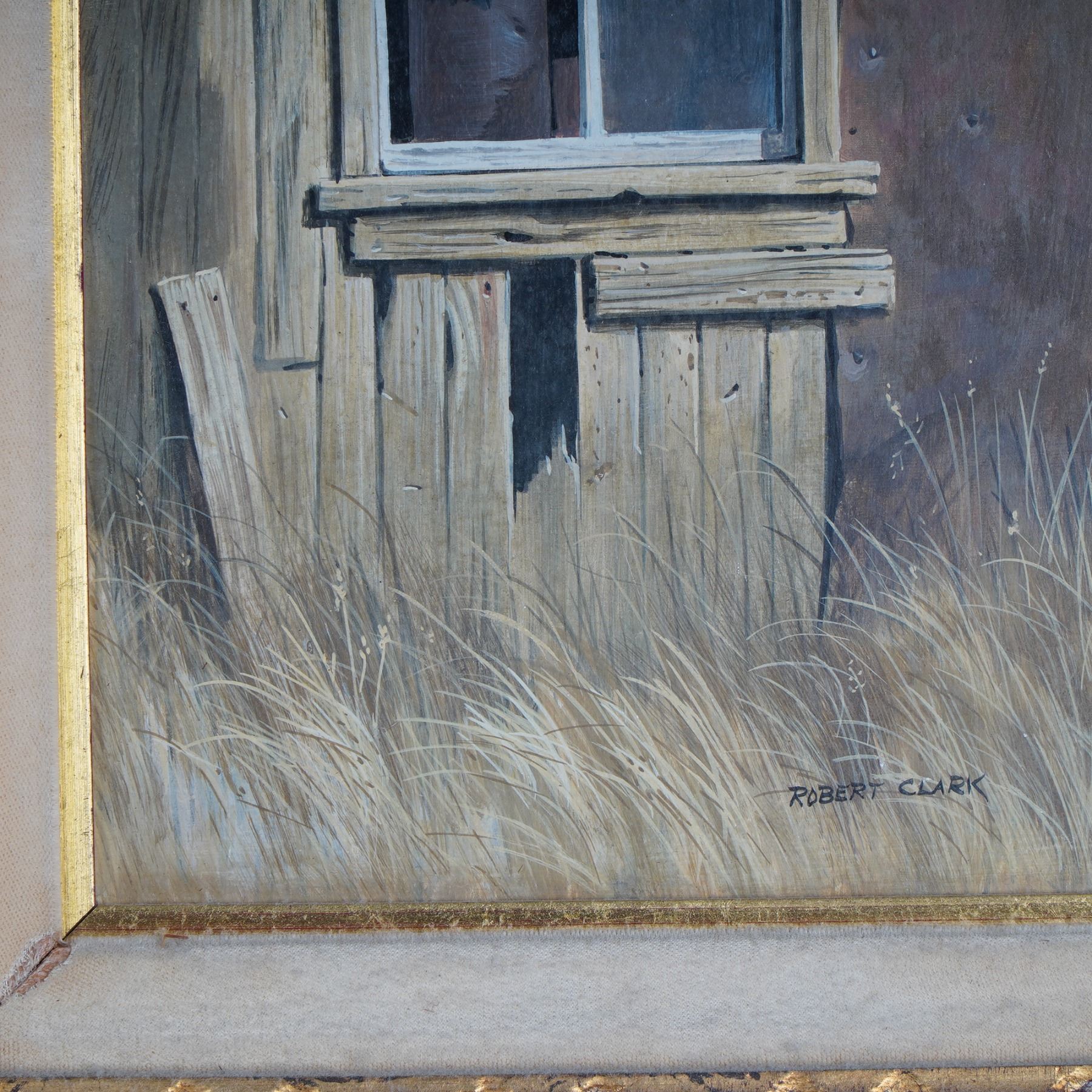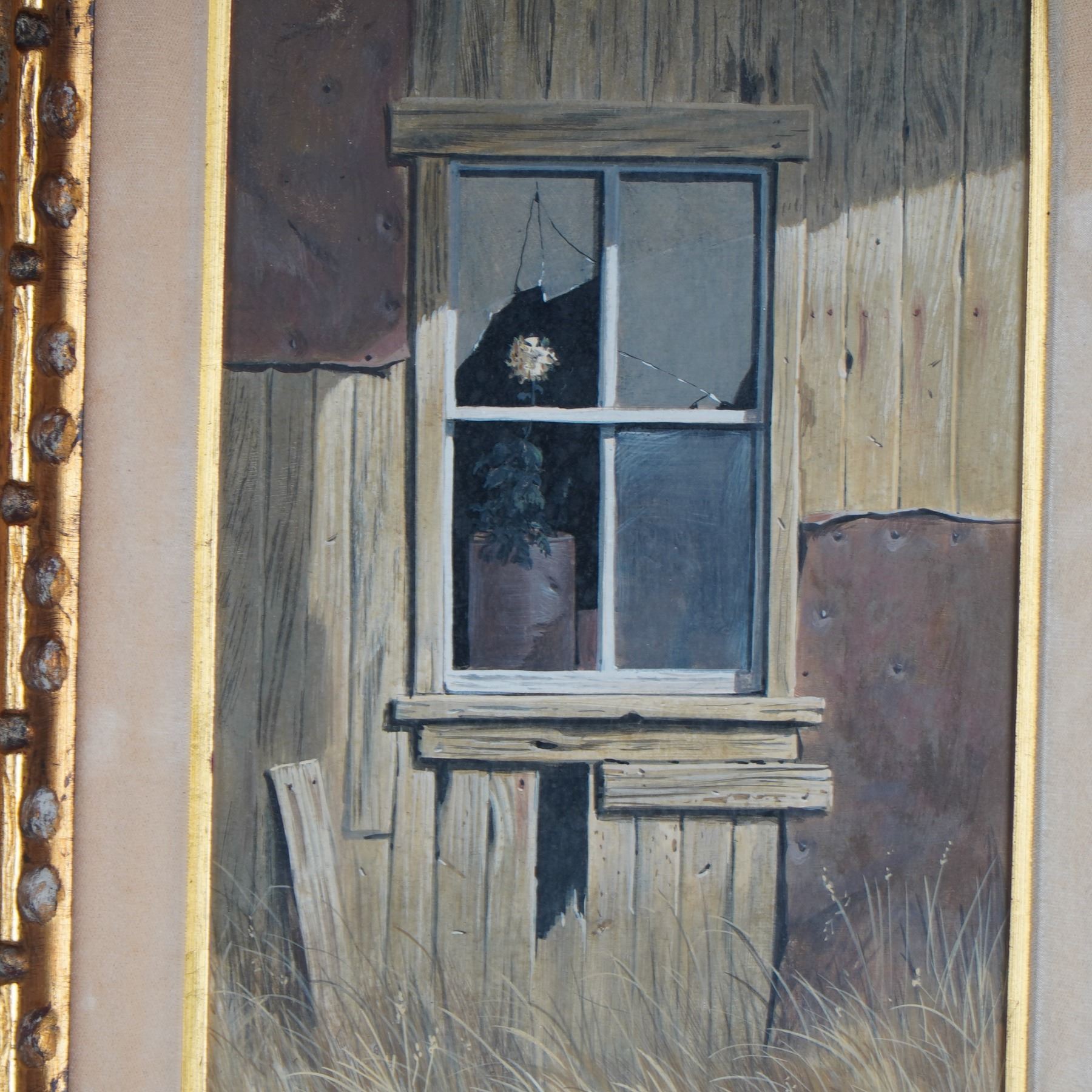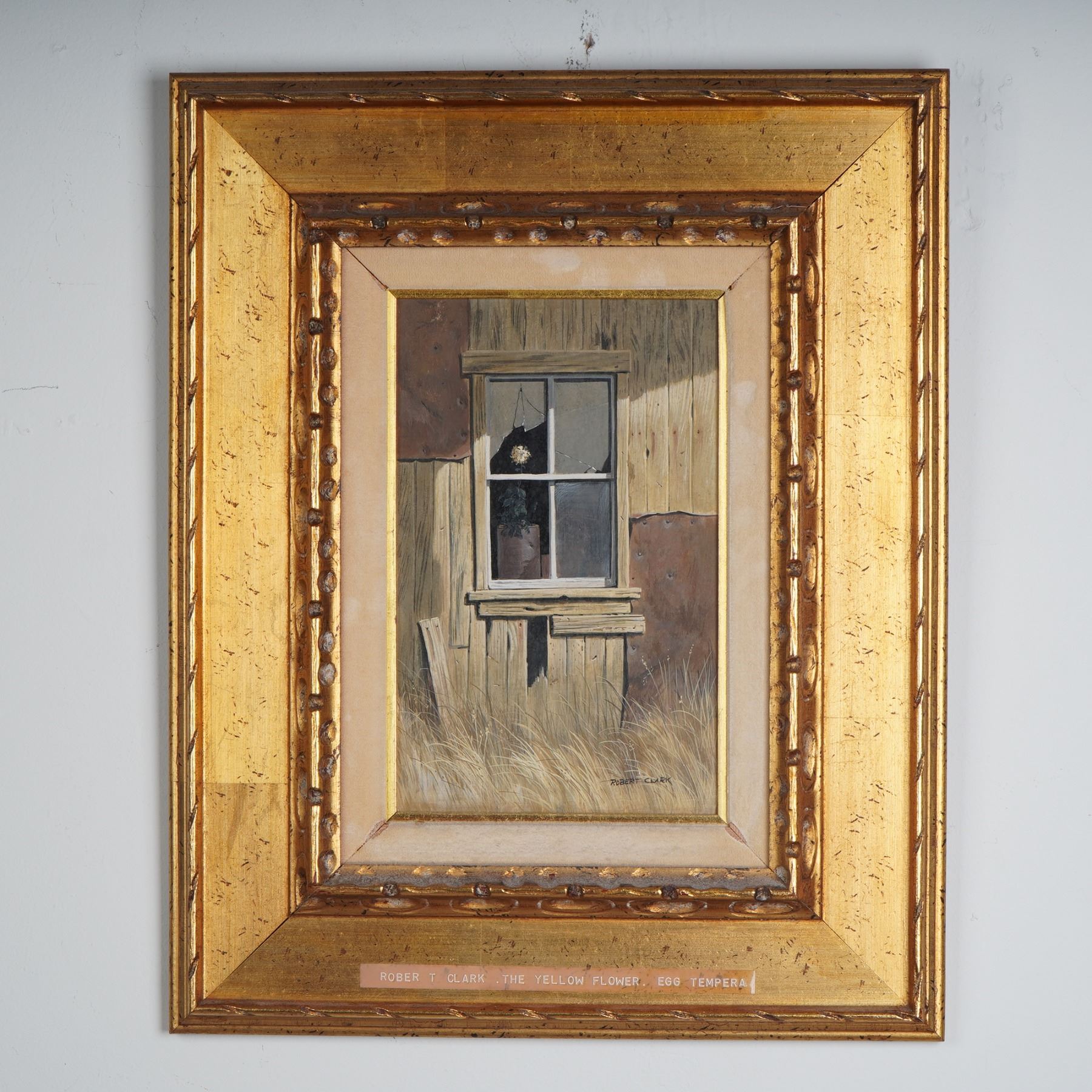 In this evocative composition titled The Yellow Flower, Robert Charles Clark masterfully renders a quiet moment of Americana through the delicate medium of egg tempera. The painting depicts the window of a weathered wooden structure, its cracked panes and sagging boards telling tales of time gone by. A single yellow flower, suspended in the window's interior, introduces a poignant contrast of life and resilience. Clark's work is celebrated for his hyperrealistic attention to rural textures, often echoing the quiet nostalgia of abandoned spaces reclaimed by nature. The artist's delicate brushwork and atmospheric use of light showcase his technical skill in a medium rarely seen in contemporary realism. With its rich detail and haunting stillness, this piece is a collector's gem. Signed lower right and presented in its original giltwood frame.