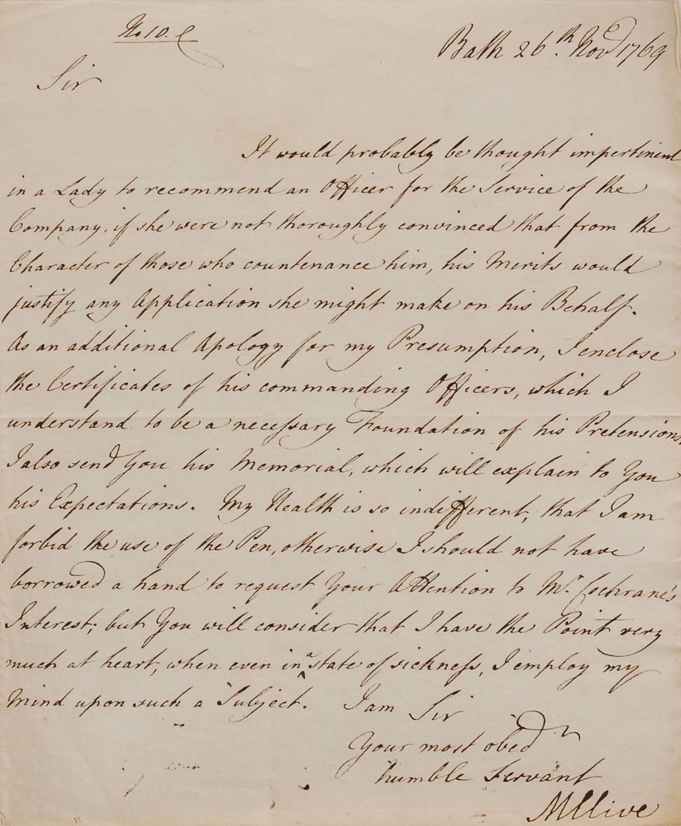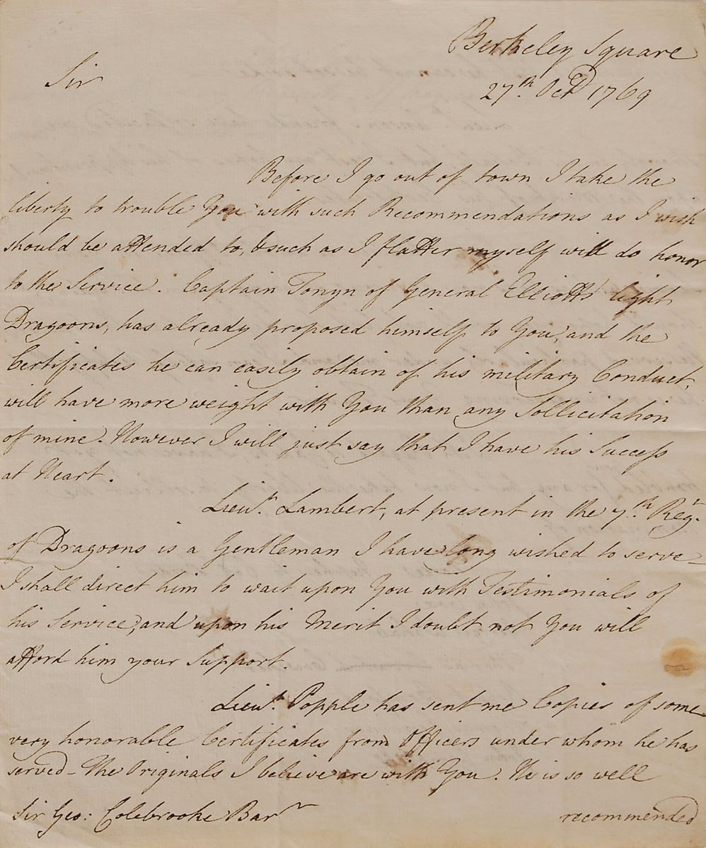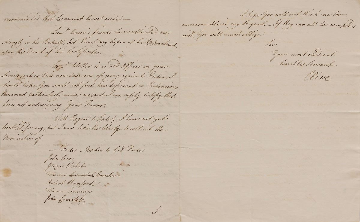 British officer (1725–1774) who served as commander-in-chief of British India and established the supremacy of the East India Company in Bengal. Sought-after pair of ALSs: an ALS signed “Clive,” three pages on two adjoining sheets, 7.25 x 9, October 17, 1769, to Sir George Colebrooke, chairman of the East India Company. In part: “I take the liberty to trouble you with such Recommendations as I wish should be attended to…Captain Tonyn of General Elliott’s light Dragoons, has already proposed himself to you and the Certificates he can easily obtain of his military Conduct will have more weight with you than any Solicitation of mine. However I will just say that I have his Success at Heart. Liet. Lambert, at present in the 7th Reg’t of Dragoons is a Gentleman I have long wished to serve…Lieut. Popple has sent me Copies of some very honorable Certificates from Officers under whom he has served…He is so well recommended that he cannot be set aside. Lieut. Anson’s friends have solicited me strongly in his Behalf…Capt. Weller is an old officer in your Service, and as he is now desirous of going again to India, I should hope you would not find him deficient.” The second was written by Robert Clive to Colebrooke on behalf of his wife, signed “M. Clive,” one page, November 26, 1769, also requesting the consideration of a soldier’s promotion. In overall fine condition, with a few small areas of light staining.