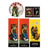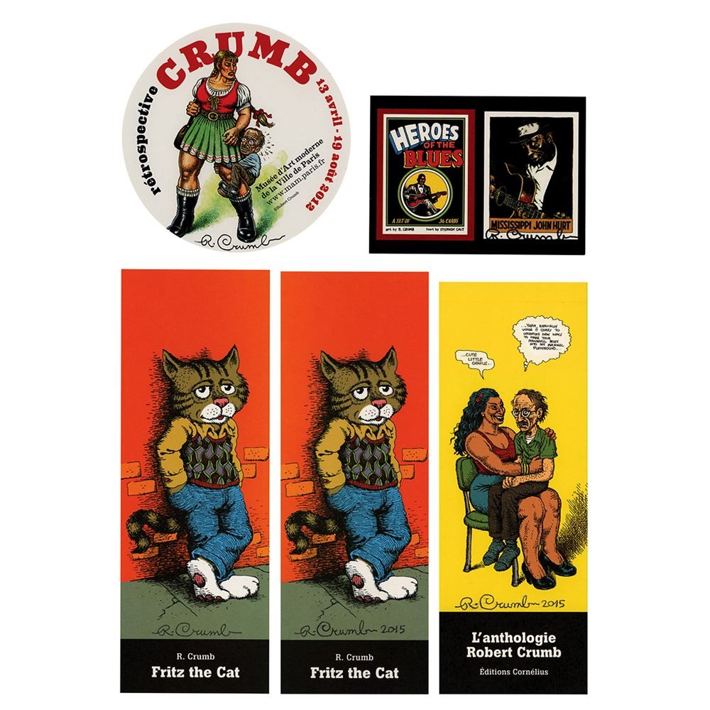 Five items signed by famed underground cartoonist Robert Crumb: two color 2.5 x 7 French language bookmark featuring artwork of Crumb's feline con artist Fritz the Cat leaning against a brick wall, signed in black ballpoint, "R. Crumb" and "R. Crumb 2015"; a color 3.75 x 2.75 trading card from the Heroes of the Blues boxed set, No. P-3, showing Crumb artwork for the boxed set and Mississippi John Hurt, signed in black felt tip, "R. Crumb"; a color 2.5 x 7 French language bookmark for 'L'anthologie Robert Crumb,' signed in black ballpoint, "R. Crumb 2015"; and a circular 4Ë card for a 2012 retrospective at Paris Museum of Modern Art in 2012, signed in black ballpoint, "R. Crumb." In overall very fine condition. Both are accompanied by certificates of authenticity from JSA.