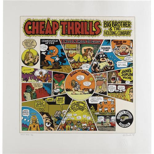<B>Robert Crumb - Cheap Thrills Serigraph Print Artist's Proof, 15/40 (Wildwood Serigraphs, 1997).</B></I> This iconic image helped to introduce two powerhouse talents to many people in the late 1960s. Big Brother and the Holding Company were one of many rock bands gigging around San Francisco at the time; they had released one minor-label album with little notice when a showcase spot at the Monterey Pop Festival got them signed to Columbia, one of the biggest labels in the business. Lead singer Janis Joplin was pals with a young, skinny cartoonist who hung around the Haight-Asbury district named Robert Crumb. Janis asked Crumb to provide the cover to the band's new, breakthrough LP, and this was the result. What we have here is a fantastic 24-color serigraph on Rives 280 gram weight 100% cotton archival paper measuring 27" x 28', with an image area of 21" x 21". Only 250 regularly signed and numbered prints were made of this first edition, with another 40 signed artist's proofs; this is Proof Edition number 15, one of several originally presented to Robert Crumb. It's far out, it's "sike-ay-delic"! It's Crumb at his very best, and this beautiful print is in Excellent condition. It comes complete with a certificate of authenticity from the publisher, Wildwood Serigraphs. <I>From the collection of Barry Silbergeld of Art & Love of Music.</B></I><BR><BR><b>Shipping:</b> Large Flat (<a target="_blank" href="http://www.heritageauctions.com/common/shipping.php">view shipping information</a>)