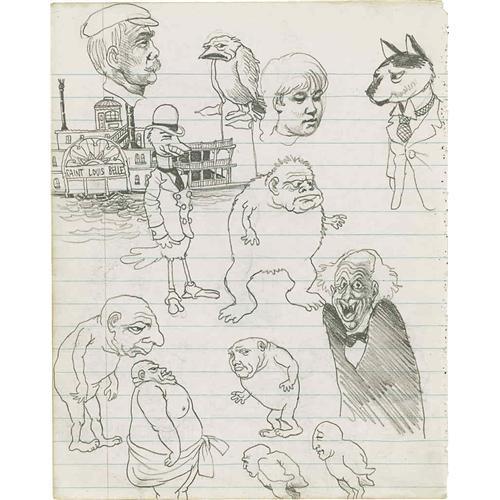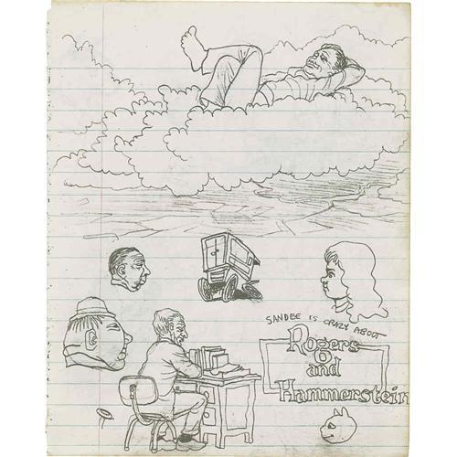 <B>Robert Crumb - "Floating in the Clouds" Sketchbook Page Original Art (circa early 1960s).</B></I> Robert Crumb could never sit still when there was a pencil and pad of paper around. Here's a page from one of his many composition books, filled with whimsical sketches including a man floating in a cloud, a drawing of sister Sandra, noting her obsession with the music of Rogers and Hammerstein, and lots of strange figures on both sides of the page. An old steamboat, the "Saint Louis Belle" is seen on the reverse, along with a "Fritz"-like cat and bird in period costumes. The page measures 6.75" x 8.5", and is in Excellent condition.