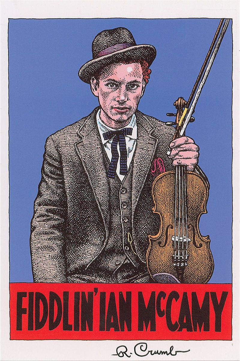 Color 4 x 5.75 postcard featuring Crumb’s work, Fiddlin’ Ian McCamy, signed in the lower border in black ink, “R. Crumb.” In very fine condition.