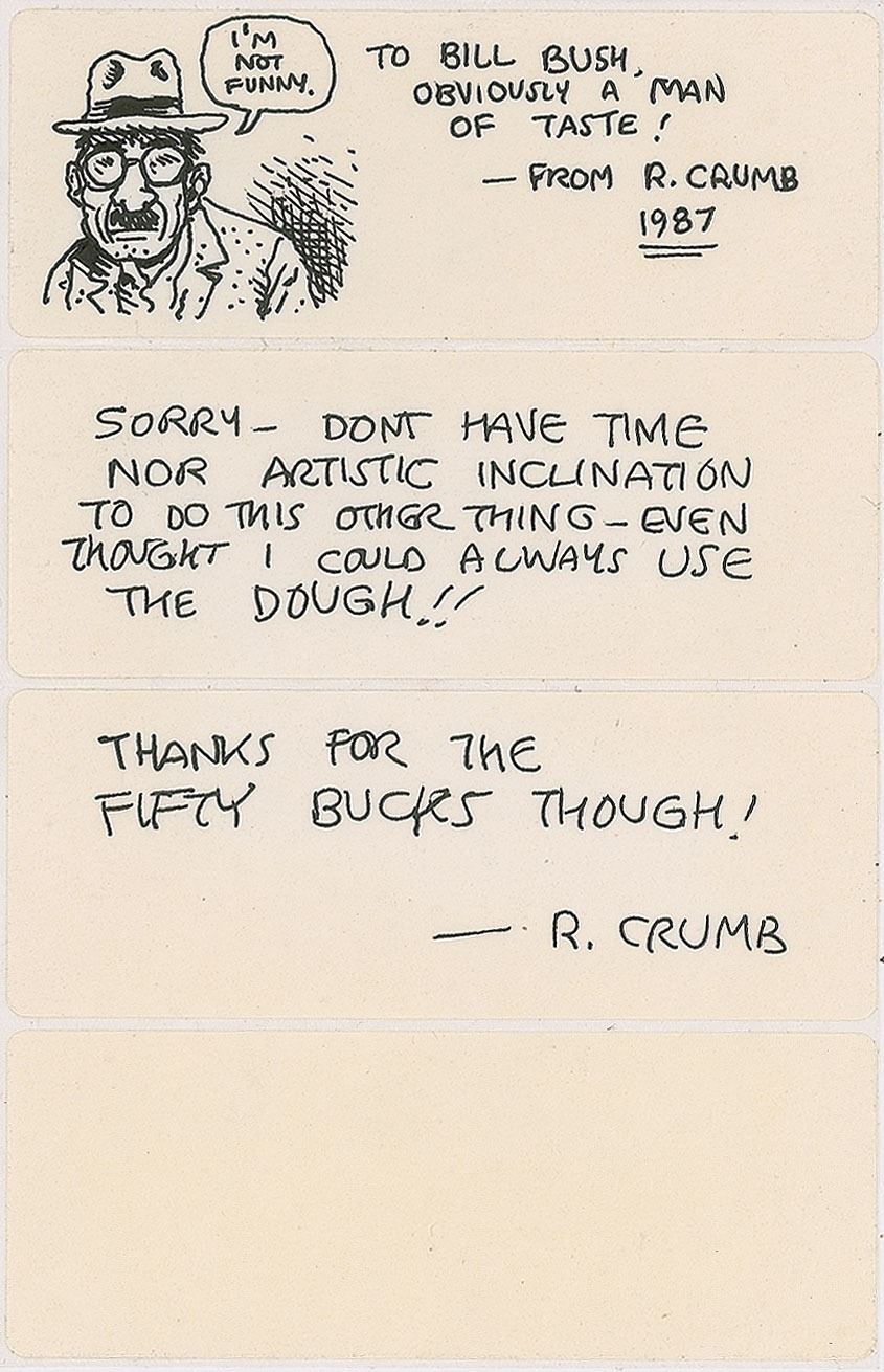 Original ink sketch of a front-facing self-portrait by Robert Crumb, which shows the artist wearing a hat and looking a bit haggard, with speech bubble to right adding, "I'm not funny." The sketch is accomplished in black ink on the uppermost off-white label on a four-label 4 x 6.25 sheet, which is also signed and inscribed, "To Bill Bush, obviously a man of taste!—from R. Crumb, 1987." The second and third labels contain an ANS signed "R. Crumb," in full: "Sorry—Don't have time nor artistic inclination to do this other thing—even though I could always use the dough!! Thanks for the fifty bucks though!" In very fine condition.