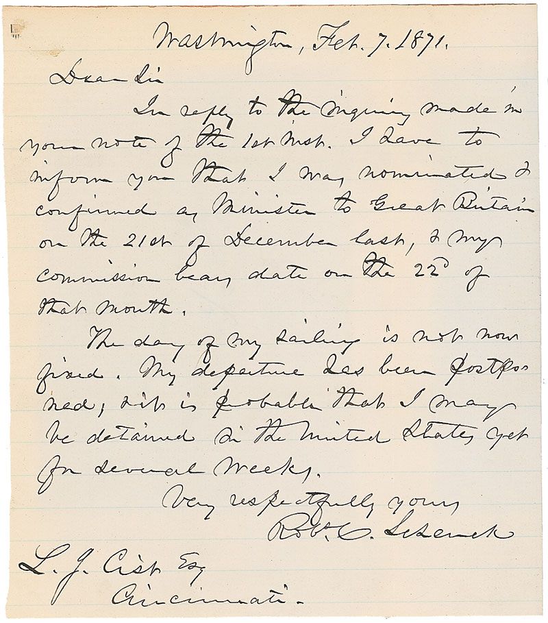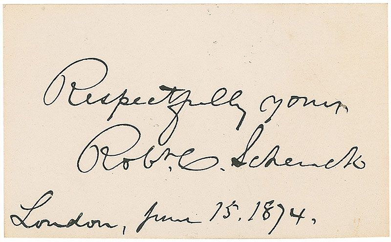 Two items: ALS,signed “Robt. C. Schenck,” one page, lightly-lined, 7.5 x 8.5, February 7, 1871. In part: “I have to inform you that I was nominated & confirmed as Minister to Great Britain on the 21st of December last, & my commission bears date on the 22d of that month.”; and an ink signature, “Respectfully yours, Robt. C. Schenck, London, June 15, 1874,” on an off-white 3.25 x 2 card. In fine condition, with intersecting folds to letter, one through a single letter of signature, and a bit of mild toning to both.