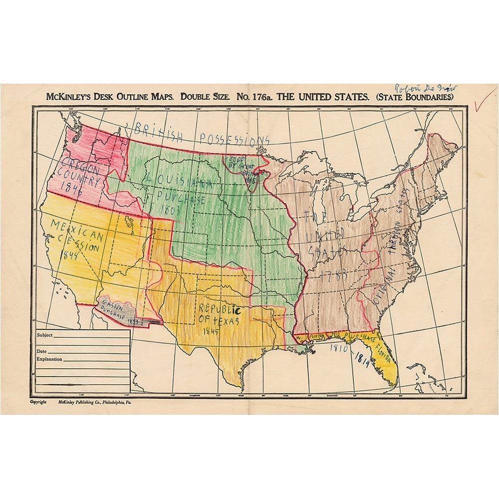Desirable piece of schoolwork filled out in ballpoint and colored pencil by the young Robert DeNiro, one page, 15 x 10, signed in the upper right corner in blue ballpoint in his youthful cursive, "Robert DeNiro." DeNiro fills out a map of the United States, identifying broad areas such as "Original Thirteen States," "Louisiana Purchase 1803," "Republic of Texas 1845," "Mexican Cession 1848," "Gasden Purchase 1853," "1810 Purchase Florida," and "Oregon Country 1846." In fine condition. A fine piece of DeNiro's elementary school homework.