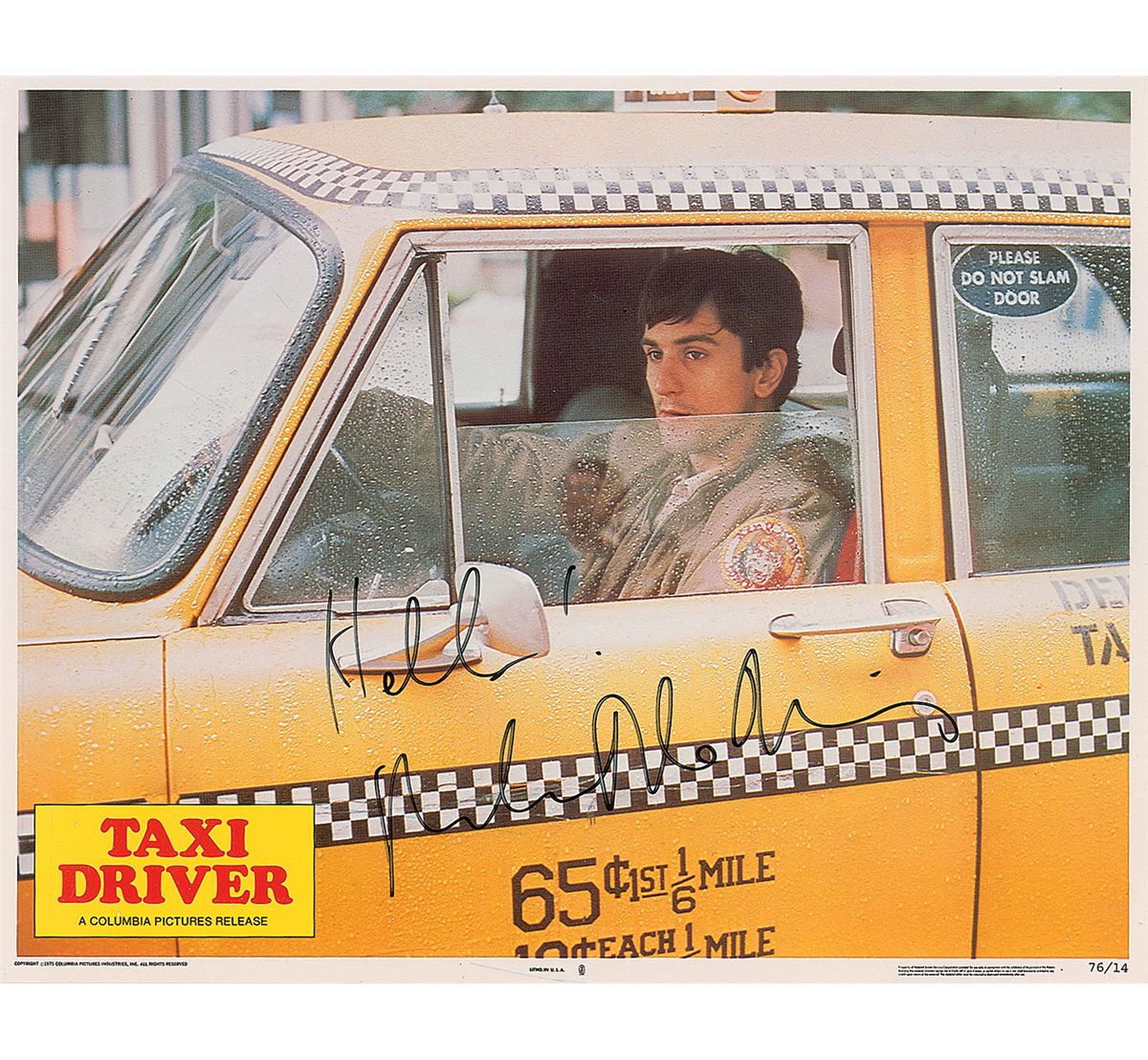 Color 14 x 11 lobby card for the classic 1976 film Taxi Driver, signed in black felt tip, “Hello! Robert De Niro.” In fine condition, with trivial edge dings.