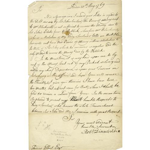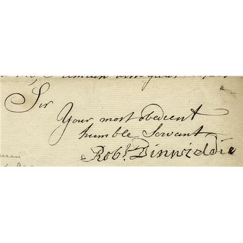 <B>Robert Dinwiddie (1721-1770), Lieutenant Governor of Virginia who appointed George Washington as a Lieutenant Colonel in 1754 to command an expedition against the French. Letter Signed,</B></I> "<I>Robt. Dinwiddie</B></I>" one page, 8" x 12.5", London, May 20, 1769 to Andrew Elliot concerning financial matters. "<I>It is a Year ago since I received your Letter in regard to the Debut due me by Sir John Sinclair... In the Meantime it is very hard upon me to be out of the Money, lent out of my Pocket, so long and indeed my chief Dependence is upon your Favour in Interfering in the Affair, and hope you excuse the Trouble I give you therein... </B></I>" Usual folds, a few minor spots, a few marginal chips, else very good to fine condition. A difficult example to obtain; this a fine specimen. From the Henry E. Luhrs Collection.