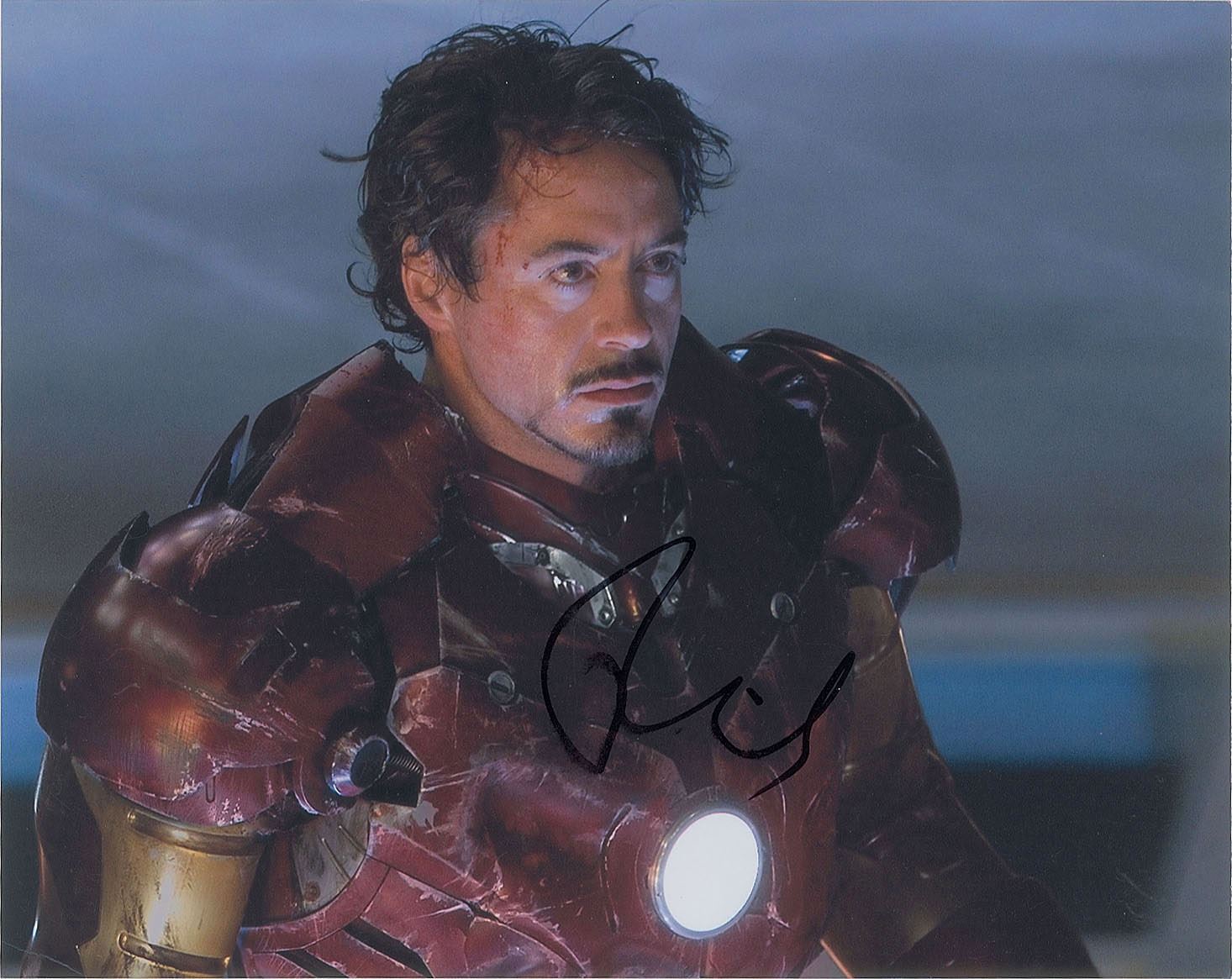 Color satin-finish 10 x 8 photo of Downey, Jr. as Tony Stark wearing his powerful Iron Man exoskeleton, signed in black felt tip. In fine condition.