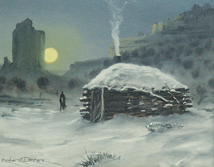 Signed original acrylic on art board a mostly monotone depiction of a winter night in Navajo land with a bright yellow moon peering out around a famous landmark. Very good condition, custom framed.,,7-1/2" x 9-1/2" (11" x 13")