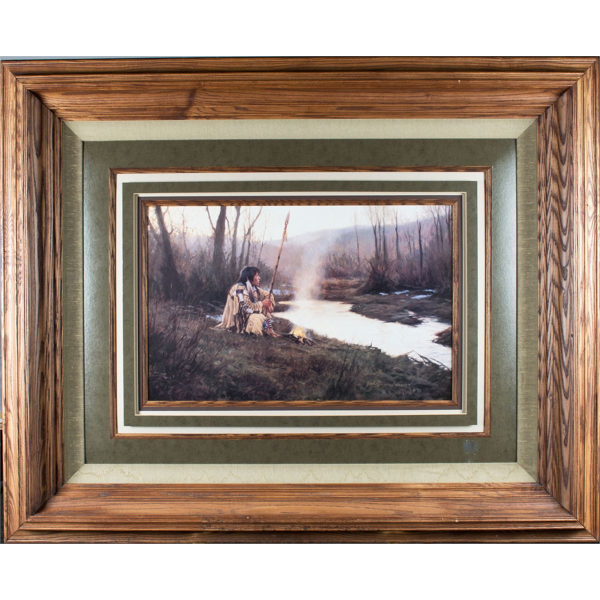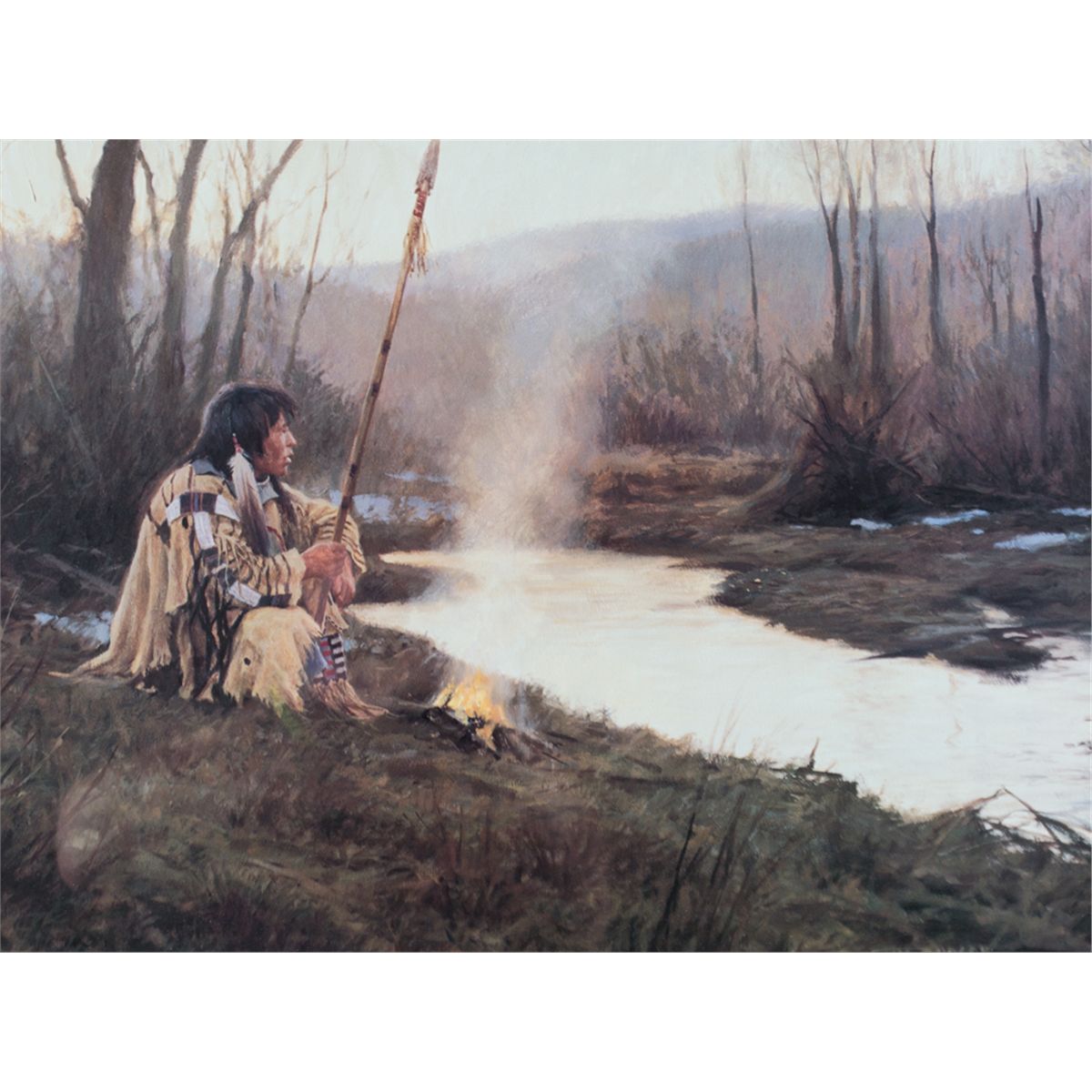 Titled "Nights Approach," depicting a seated Native American near a river, with a small fire. Printed signature and date '84 in LR. Robert Duncan (1952-), Utah, is known for western landscape with wildlife and figures/snowscenes. Matted and framed in an oak frame and behind glass, 17.25" H x 27.5" W, sight, 44" H x 54" W, framed. Private collection St. Clair, MI.