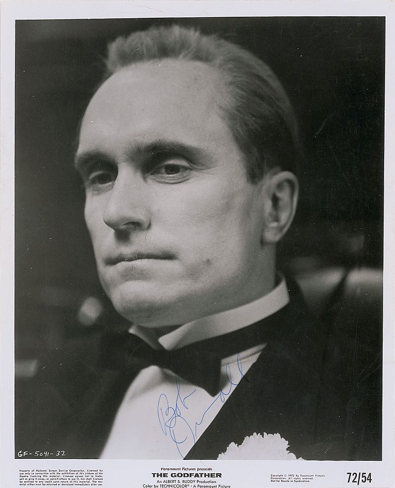Glossy 8 x 10 Paramount Pictures promotional photo for The Godfather featuring Duvall as Tom Hagen, signed in blue ballpoint. Scattered light creasing and surface impressions, trimmed bottom edge, otherwise fine condition.