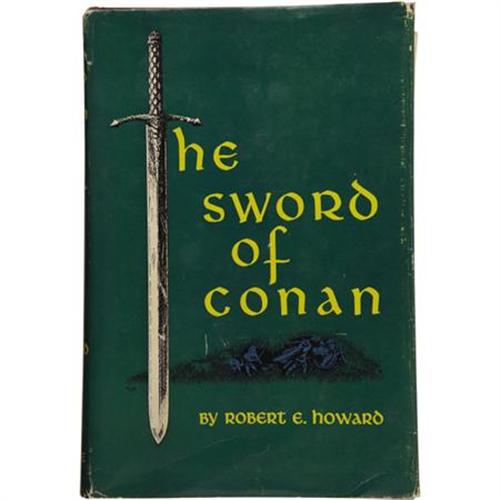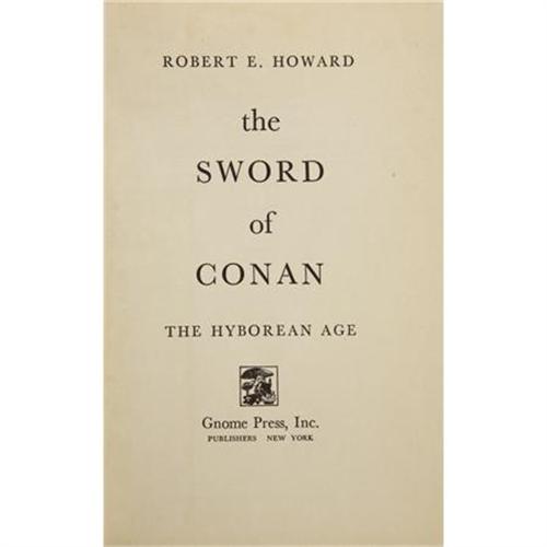 <B>Robert E. Howard. </B></I><B><I>The Sword of Conan</B></I></B></I><B>.</B></I> New York: Gnome Press, Inc., 1952.<BR><BR>First edition. Octavo. 251 pages.<BR><BR>Original maroon cloth with black titles on the spine and front board. Light shelf wear to the extremities. Internal contents tight but slightly toned as is common with this publisher. Rear hinge cracked between the endpapers. Dust jacket worn at the edges and at the head and foot of the spine. Small closed tear at the head of the spine. Back panel with minor soiling from shelf wear. Very good. <I>From the Robert and Diane Yaspan Collection.</B></I><BR><BR><b>Shipping:</b> Books & Catalogs (<a target="_blank" href="http://www.heritageauctions.com/common/shipping.php">view shipping information</a>)