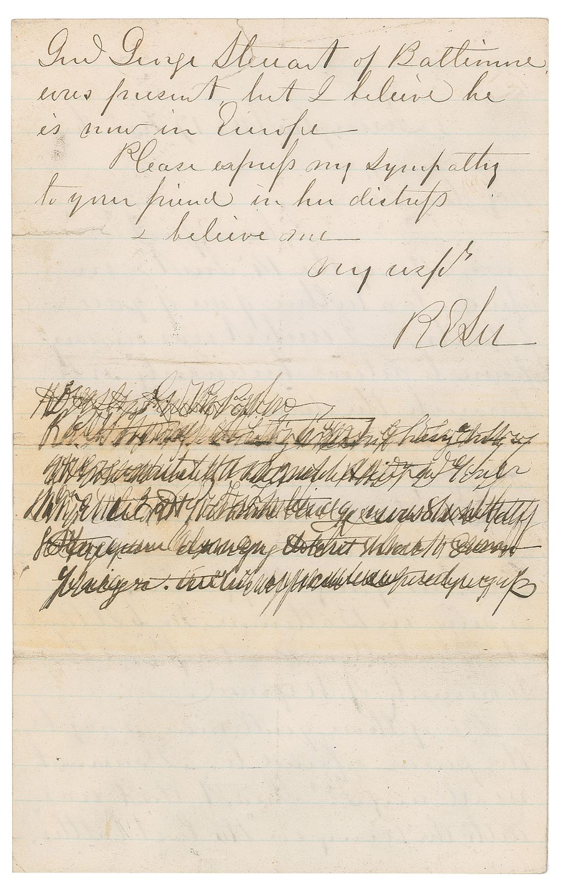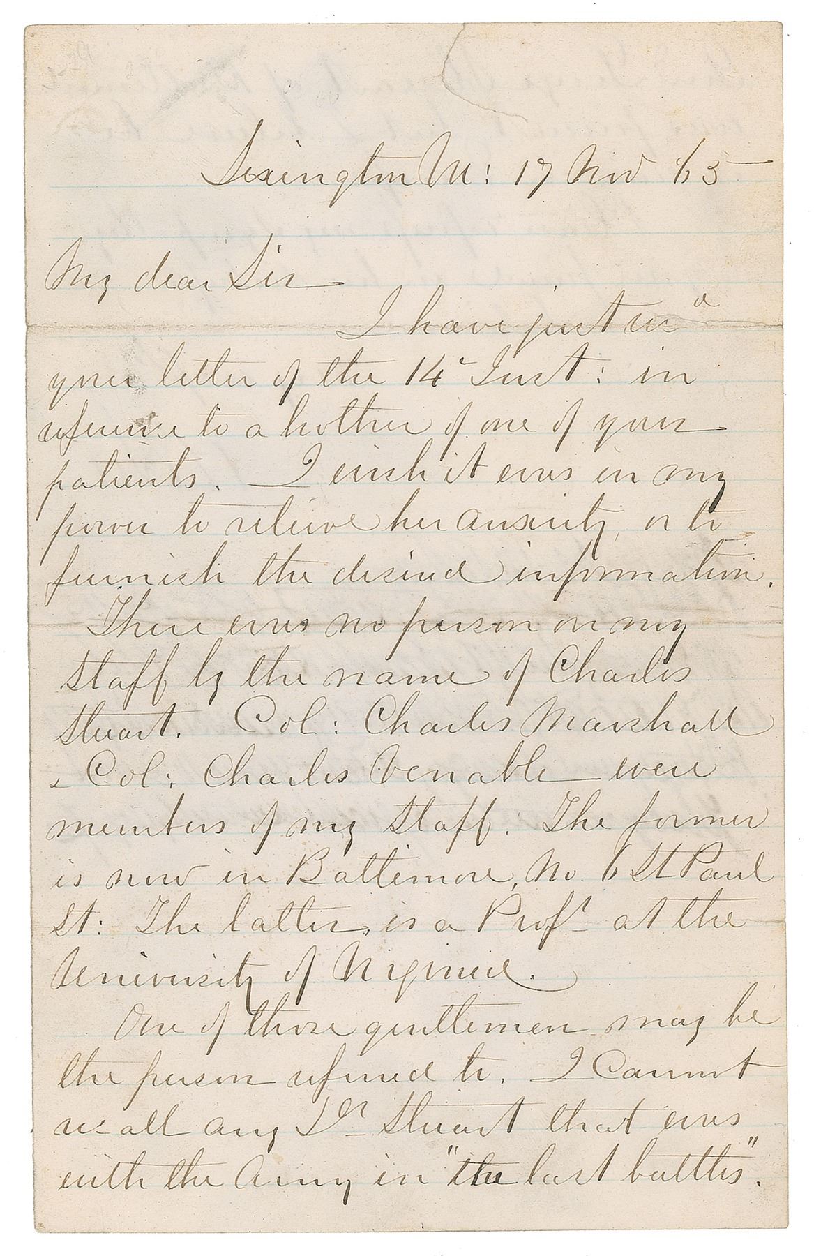 ALS signed “R. E. Lee,” one page both sides, 5 x 8, November 17, 1865. Letter written from Lexington, Virginia, just seven months after his surrender at Appomattox. In part: "I wish it was in my power to relieve her anxiety, or to furnish the desired information. There was no person on any staff by the name of Charles Stuart. Col: Charles Marshall & Col. Charles Venable were members of my staff. The former is now in Baltimore…the latter is a Prof'r at the University of Virginia. One of those gentlemen may be the person referred to. I cannot recall any Dr. Stuart that was with the Army in 'the last battles.' Gen'l George Stuart of Baltimore was present but I believe he is now in Europe. Please express my sympathy to your friend in her distress." Several lines below Lee's signature have been struck through. In very good to fine condition, with a split to the end of one fold, and a tear to the top edge.