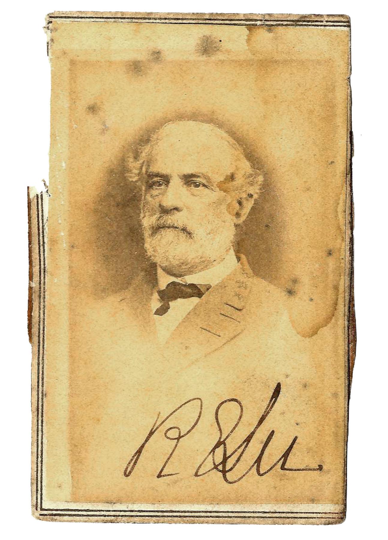 Very rare Robert E. Lee CDV photo signed clearly ''R. E. Lee'' at bottom. Verso of photo has a George Washington 2-cent revenue stamp and a backmark from the then well-known studio, ''Vannerson & Jones Photographers / 77 Main Street / Richmond, Va.'' Photo, measuring 2.5'' x 4'', has dampstaining in spots and uneven left and right edges from tape remnants on verso. Very good condition overall.