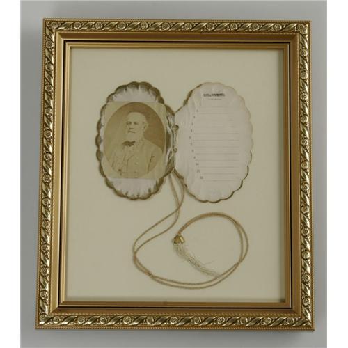 <B> Robert E. Lee Dance Card,</B></I> 4.5" x 3.25" unfolded, 1876, White Sulphur Springs, West Virginia. This uninscribed dance card was either never used or belonged to an unnoticed wallflower. Either way, it is a memento of the Lee Monument fund-raising ball which was held at the Greenbrier Hotel in White Sulphur Springs, West Virginia during Reconstruction's waning days. The monument today proudly dominates Richmond's Monument Avenue. Tipped into the inside front of the card is a CDV-style 1862 likeness of General Lee in full Confederate uniform. The opposing panel is printed with blank spaces for the names of a dozen dance partners. A thin cord, approximately 6.0" long, is affixed to the piece. Light browning, a crease along the left edge of Lee's image not affecting the portrait. Very Good condition. In gilt frame, 7.5" x 8.5". <BR><BR><B>Important notice:</