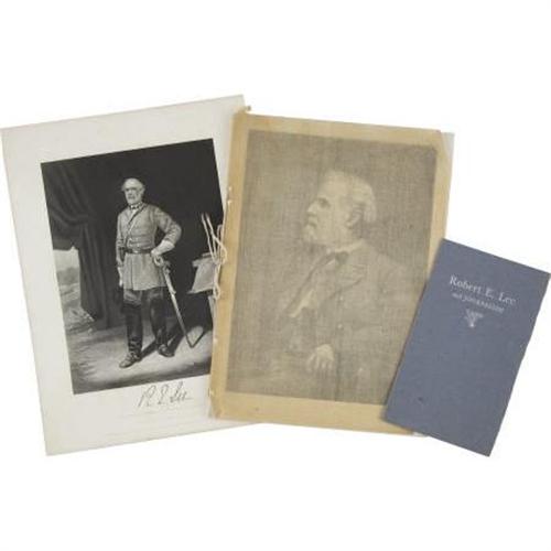 <B>Robert E. Lee Ephemera Lot. Includes:</B></I><BR> <B>Civil War Engraving of General Robert E. Lee. </B></I>8" x 10.75", Johnson Fry & Co. Publishers New York. Slight staining and fading in margins beyond engraving, especially at bottom and edges, and on verso.<BR><B>Lee Memorial Fund Booklet.</B></I> Washington and Lee University, Lexington, VA., 1921. 7.25" x 10", 31 pages, engraved portrait of Robert E. Lee on cover. Pages are bound by cotton cord, with brown rice paper over booklet cover, obverse top and bottom corners folded, nicks on bottom and top edges and spine. Cover has small tear at top in margin beyond engraving, with worn outer edges and a crease inside front cover near spine due to folding. Fading on outer edge of pages from sun exposure. <BR><B>Robert E. Lee and Journalism Booklet.</B></I> Washington and Lee University, Lexington, VA., 1950, 3.75" x 6.25", 7 pages, "<I>A Letter to the Newspaper Publishers of America </B></I>". Commemorating the Bicentennial of Washington and Lee University. A 3-cent postage stamp is attached to second page, the first stamp issued by the Post Office Department to honor an American college. Light bending near outer edge of each page and light fading on cover.<BR><BR><BR><b>Shipping:</b> Flat Material, Small (<a target="_blank" href="http://www.heritageauctions.com/common/shipping.php">view shipping information</a>)