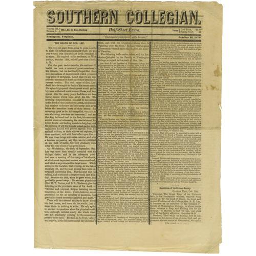 <B>Washington College Newspaper, <I>Southern Collegian</B></I>,</B></I> four pages, folio (11.5" x 15"), Lexington, Virginia, October 15, 1870. A popular Robert E. Lee collectible, this special edition newspaper is edged in black throughout and is devoted to the passing of Washington College's beloved president. Details of General Lee's death and funeral arrangements are meticulously conveyed to the reader. Marginal splits along fold lines, minor staining. Very good condition.<BR><BR><b>Shipping:</b> Flat Material, Small (<a target="_blank" href="http://www.heritageauctions.com/common/shipping.php">view shipping information</a>)