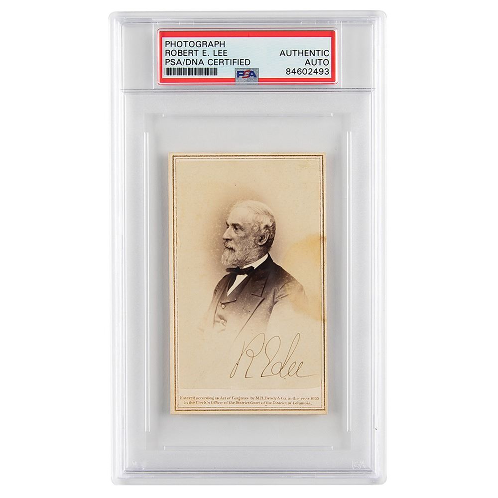 Scarce 2.5 x 4 carte-de-visite portrait of the Confederate commander by Mathew Brady, depicting Robert E. Lee in a bust-length left-facing pose, signed at the bottom of the image in ink, “R. E. Lee.†Reverse bears Brady's backmark, “M. B. Brady & Co., National Photographic Portrait Galleries, No. 352 Pennsylvania Av., Washington, D.C. & New York.†Caption to lower front margin reads: “Entered according to Act of Congress by M. B. Brady & Co. in the year 1865 in the Clerk’s Office of the District Court of the District of Columbia.†In fine condition, with a light semicircular stain to the right side. Encapsulated in a PSA/DNA authentication holder.