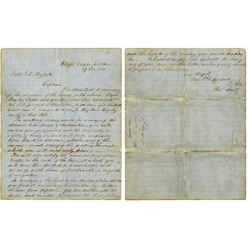 <B>Robert E. Lee War Date Autograph Letter Signed</B></I>,<B> </B></I><I>“R E Lee</B></I>"<I>,</B></I> two pages, 7.75” x 10”, Coosawhatchie, South Carolina, December 29, 1861, to Captain John Newland Maffitt. In part: “<I>If a steamboat be necessary for the execution of the service, with which Capt. Ives, Eng Dept, and yourself have been charged, you will proceed to Charleston, to ascertain if a suitable vessel can be assigned to you by Brig. Gen'l Ripley comd'g in that Dist. In making arrangements for conveying the steamer to her point of destination, you will exercise your judgment, as to the propriety or safety of doing so, and will take measures before hand, to ascertain whether any of the enemy's vessels occupy the waters through which you will necessarily pass. You will also notify the commanders of our troops, on the route, of the time, at which you will pass their pickets, or commands, and arrange with them, if practicable, a signal of recognition. In conveying the boat to her destination, should you find it necessary to abandon her, to save the crew from capture, you are authorized to do so, and in order to prevent the boat falling into the hands of the enemy you must destroy her & light draught boat suitable for bringing off your crew, in the latter contingency, must be prepared in Charleston.</B></I>” A highly collectible manuscript with the above transcribed body text consisting of 26 lines the General's hand. The verso is docketed, most likely by Maffitt himself, as follows: “<I>Genl Lee Special order Decr 29 “/61</B></I>”. Old archival repairs along smoothed folds, marginal browning and light fading as expected. Overall very good condition.<BR>Robert E. Lee, an experienced engineering officer, was, in late 1861, assigned the task of improving the coastal defenses between Charleston and Savannah. The future Army of Northern Virginia commander was assisted by the able John Newland Maffitt, who would come to earn his own formidable reputation as captain of the commerce raider C.S.S. <I>Florida.</B></I><BR><BR><b>Shipping:</b> Flat Material, Small (<a target="_blank" href="http://www.heritageauctions.com/common/shipping.php">view shipping information</a>)