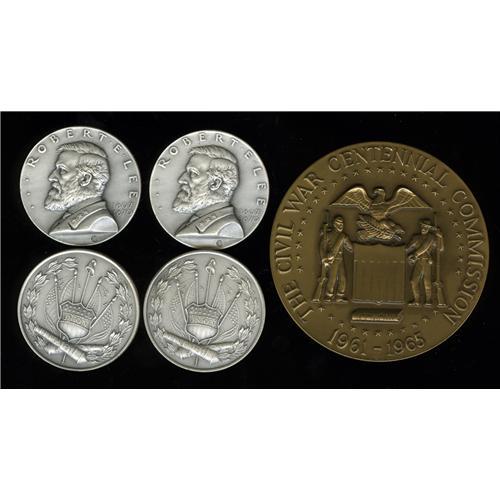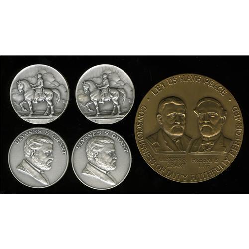 <B>Robert E. Lee and Ulysses S. Grant Silver Medallion Sets.</B></I> Two sets of silver medallions struck by the Medallic Art Company to commemorate the 100th anniversary of the end of the Civil War. Both are identical except for the matching serial numbers, 3235 and 3236. Also includes a medal struck by the Medallic Art Company in bronze, commemorating the same event. The current market value is about $100.<BR><BR><b>Shipping:</b> Coin/Currency (<a target="_blank" href="http://www.heritageauctions.com/common/shipping.php">view shipping information</a>)