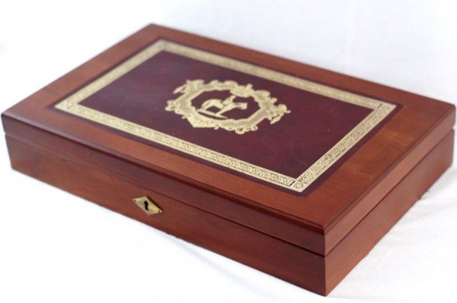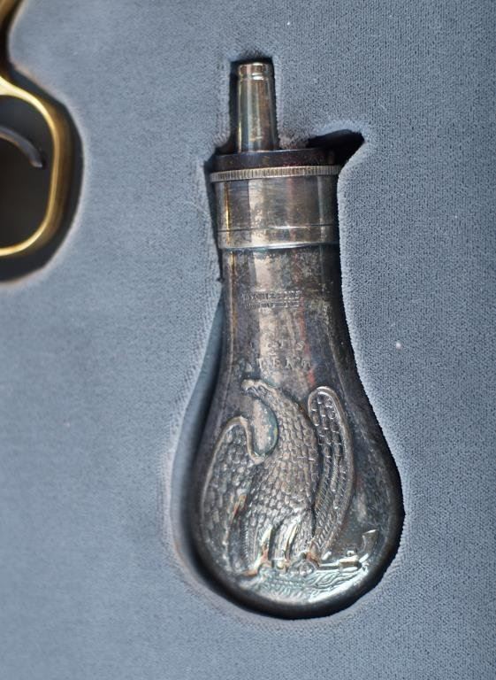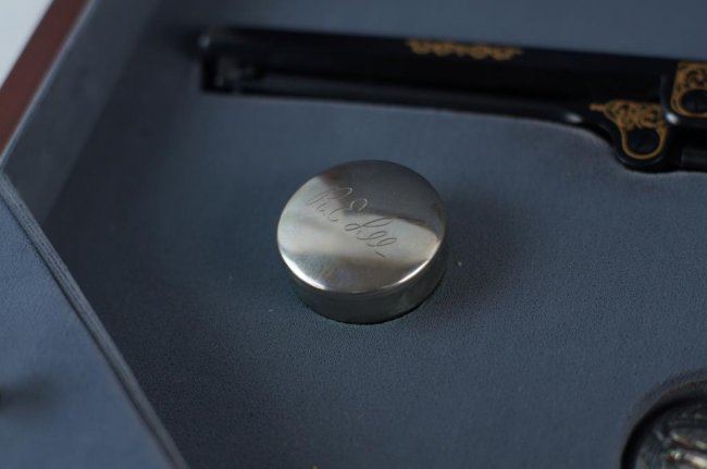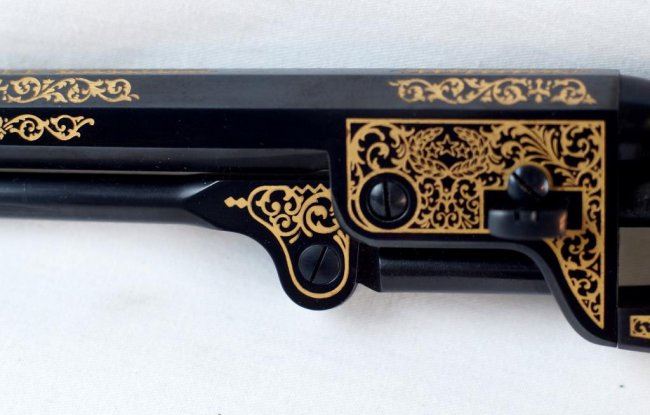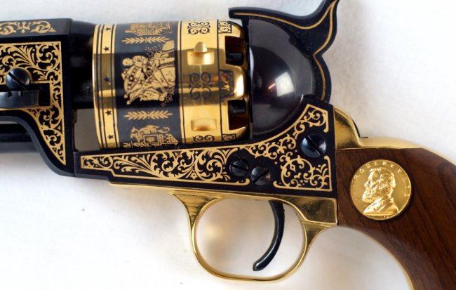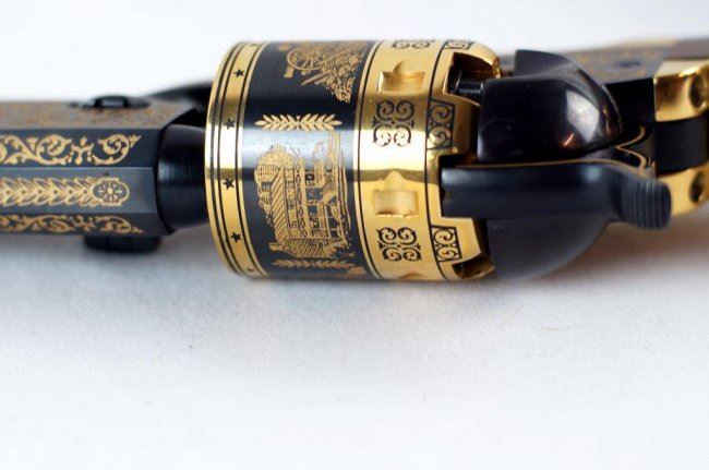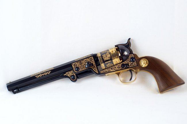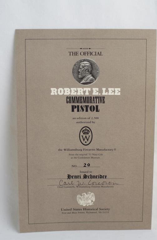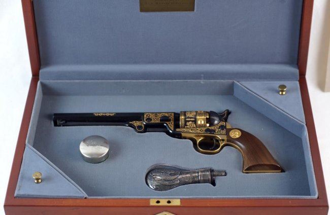 1851 Colt Navy revolver made in Italy for U.S. Historical Society, .36 caliber, 7.5" barrel, Blue finish with gold etched accents, gold-plated grip straps. Walnut grips with Rob't. E. Lee medallion, housed in a French fitted walnut case with flask, medallion, and silver-plated cap box.