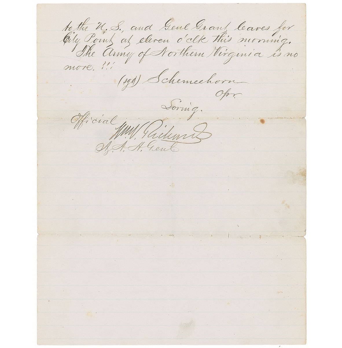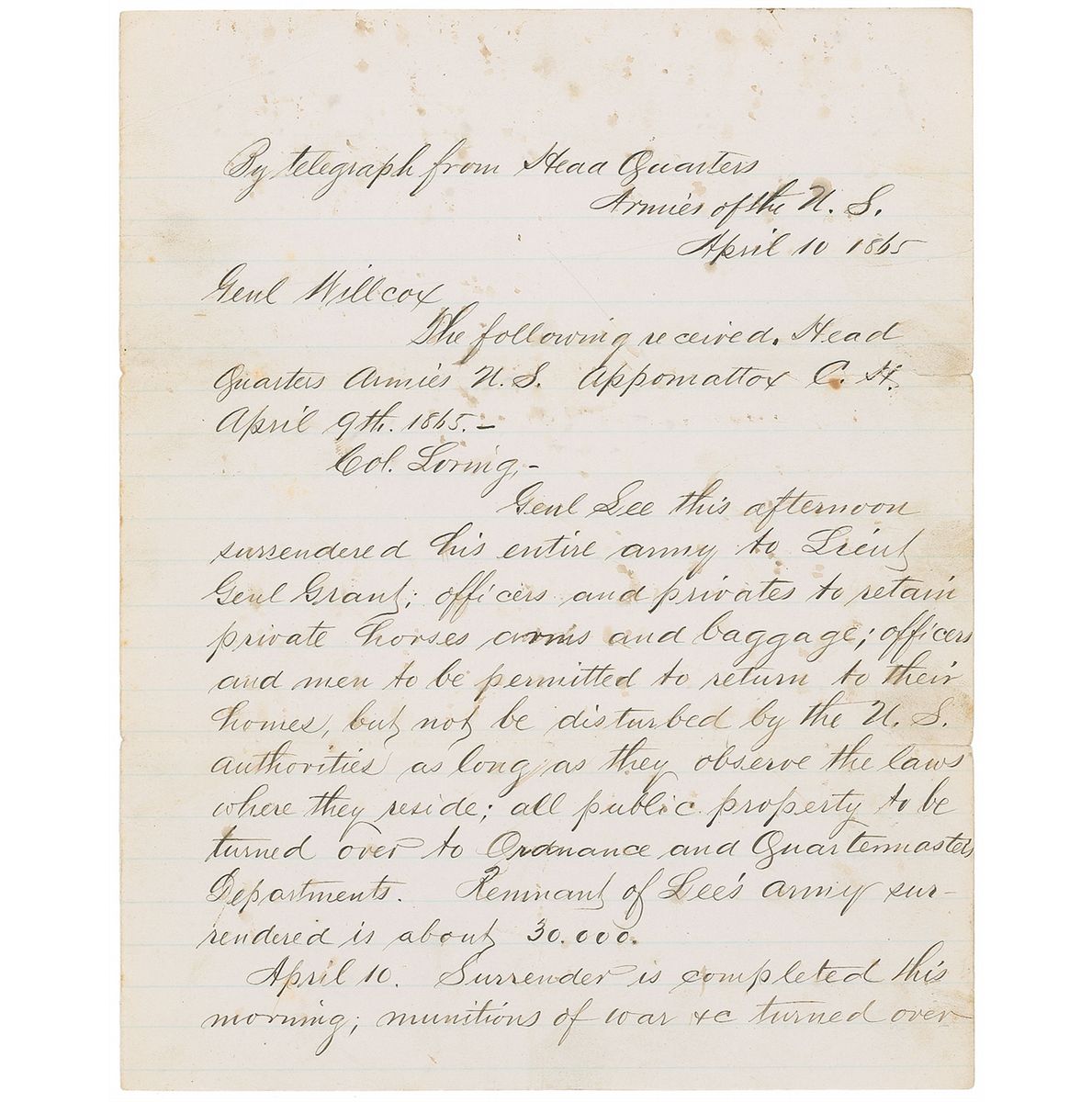 War-dated autograph telegram, signed “Loring,” two pages, lightly-lined, 7.75 x 10, April 10, 1865. Colonel Charles G. Loring transcribes the telegram sent by the “Head Quarters Armies U. S. Appomattox C. H. April 9th. 1865,” to transmit to Bvt. Major General Orlando B. Wilcox. In full: “Genl Lee this afternoon surrendered his entire army to Lieut Genl Grant; officers and privates to retain private horses, arms, and baggage; officers and men to be permitted to return to their homes, but not be disturbed by the U. S. authorities as long as they observe the laws where they reside; all public property to be turned over to Ordinance and Quartermaster Departments. Remnants of Lee’s army surrendered is about 30,000. April 10. Surrender is completed this morning; munitions of war, etc. turned over to the U. S. and Genl Grant leaves for City Point at eleven o’clk this morning. The Army of Northern Virginia is no more!!!” The transcript was subsequently made official by the endorsement of Brigadier General Lewis Richmond at the conclusion. In very good condition, with intersecting folds with tape-repaired partial edge separations, and scattered foxing.