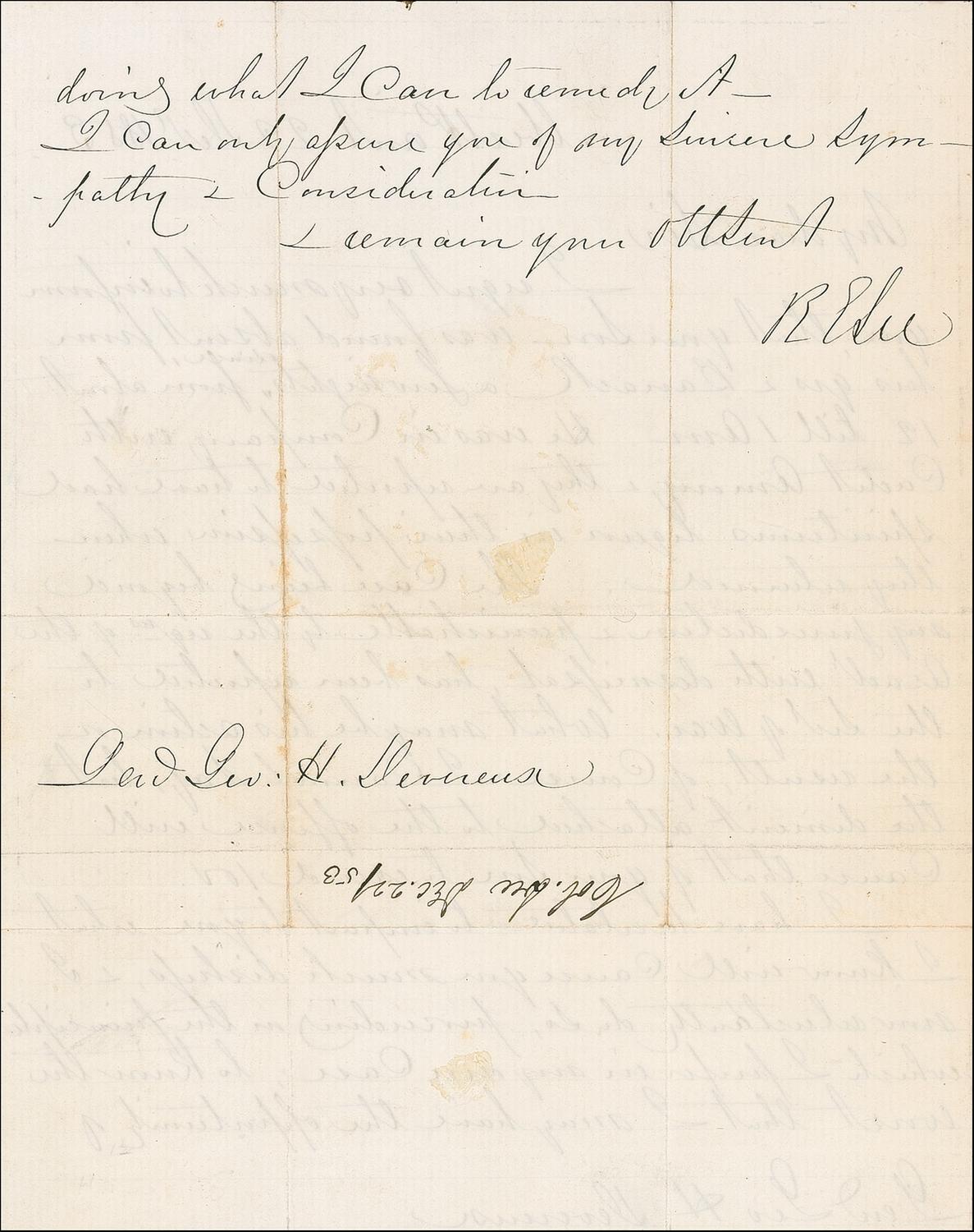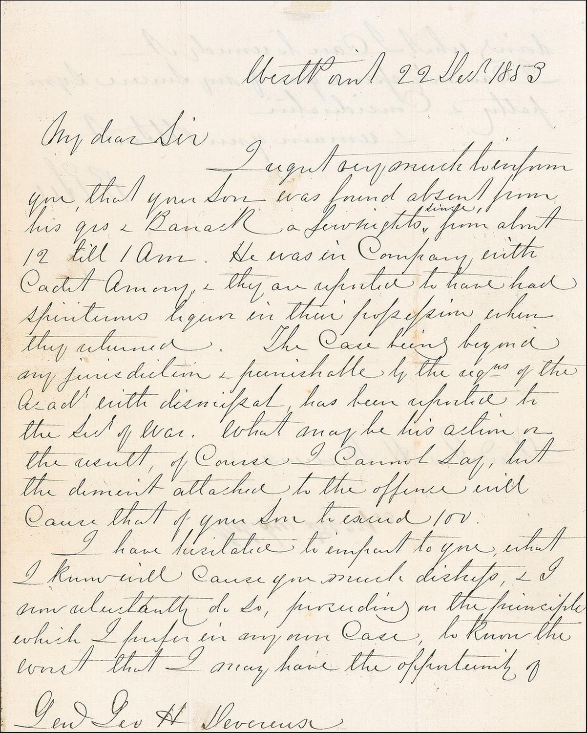 ALS signed “R. E. Lee,” one page both sides, 7.75 x 9.75, December 22, 1853. Lee writes from West Point to General George H. Devereux, about his son, Arthur Forrester Devereux. In full: “I regret very much to inform you that your Son was found absent from his qrs & Barrack a few nights since from about 12 till 1 AM. He was in Company with Cadet Amory, & They are reported to have had spirituous liquor in their possession when they returned. The Case being beyond my jurisdiction & punishable by the reg'ns of the Acd'y with dismissal, has been reported to the Sec'y of War. What may be his action or the result, of Course, I cannot Say, but the demerit attached to the offense will cause that of your Son to exceed 100. I have hesitated to impart to you what I know will cause you much distress, & I now reluctantly do so, proceeding on the principle which I prefer in my own case, to know the worst that I may have the opportunity of doing what I can to remedy it. I can only assure you of my sincere sympathy & consideration.” Letter is housed in a beautiful quarter-leather custom case. In fine condition, with intersecting folds, and some scattered light toning and soiling.